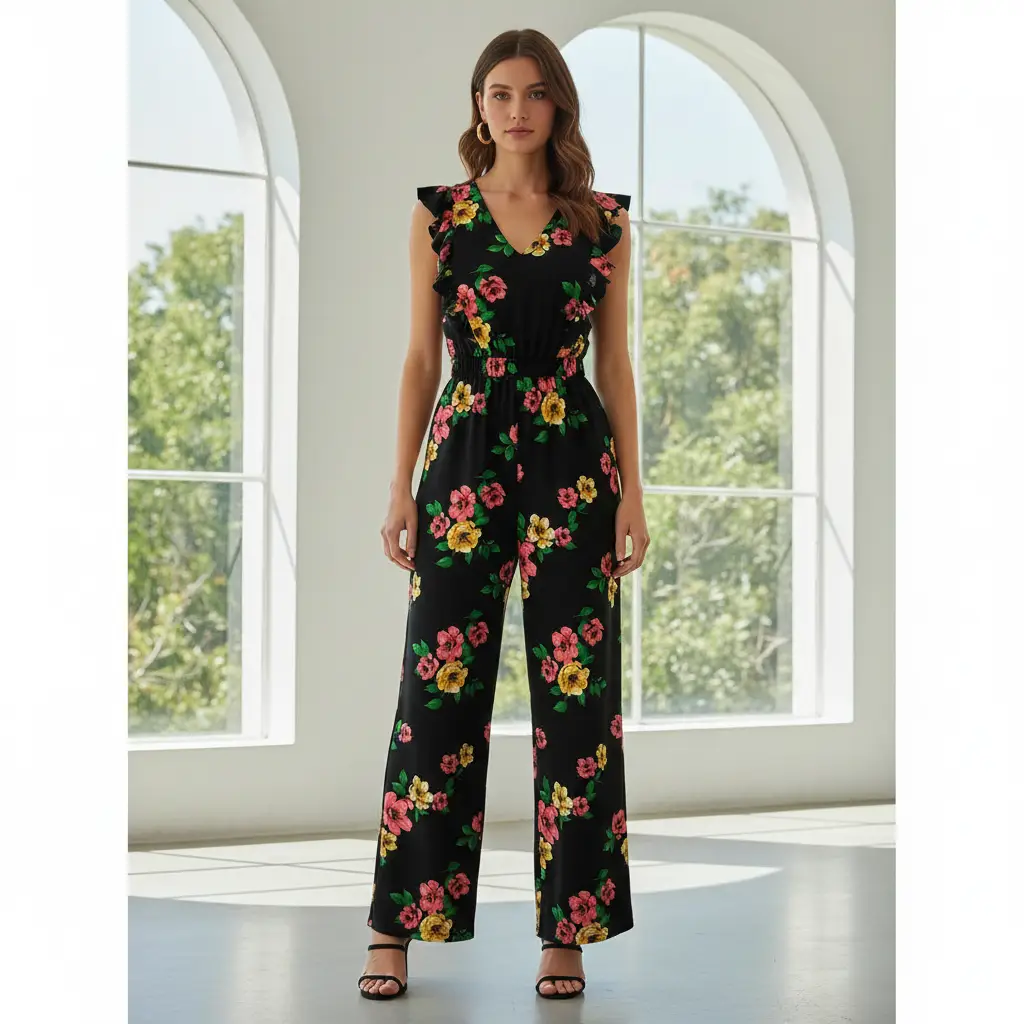 Tessuto Cady elasticizzato a fantasia motivo floreale giallo – nero – corallo