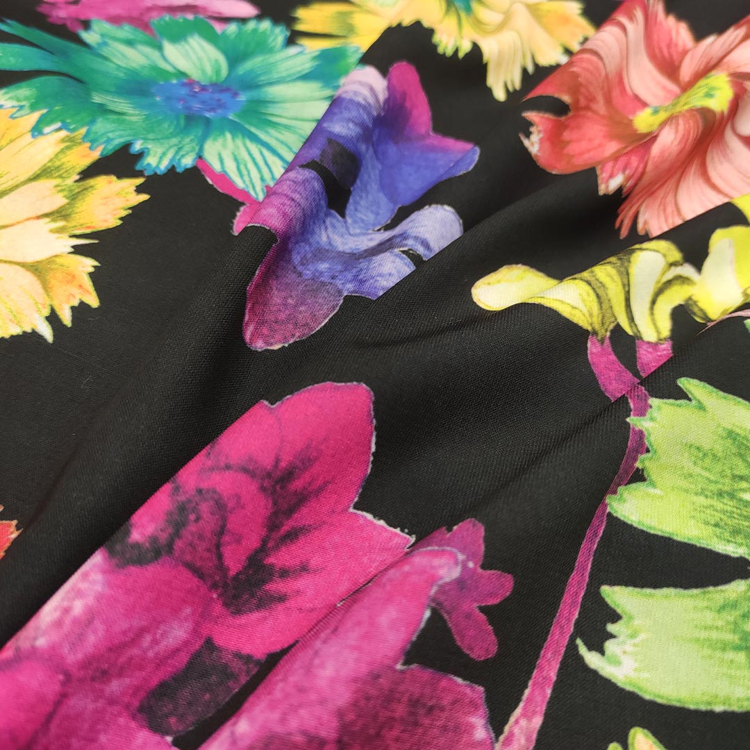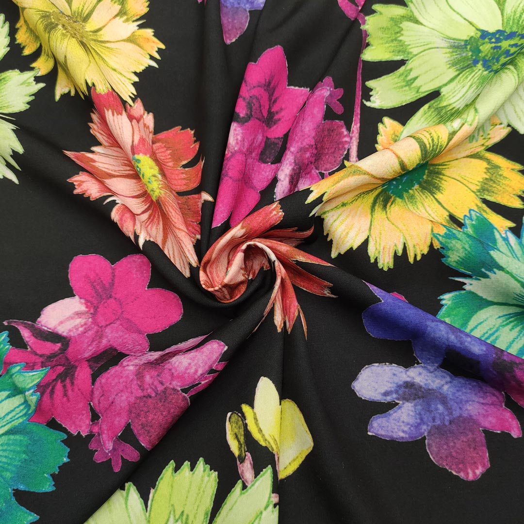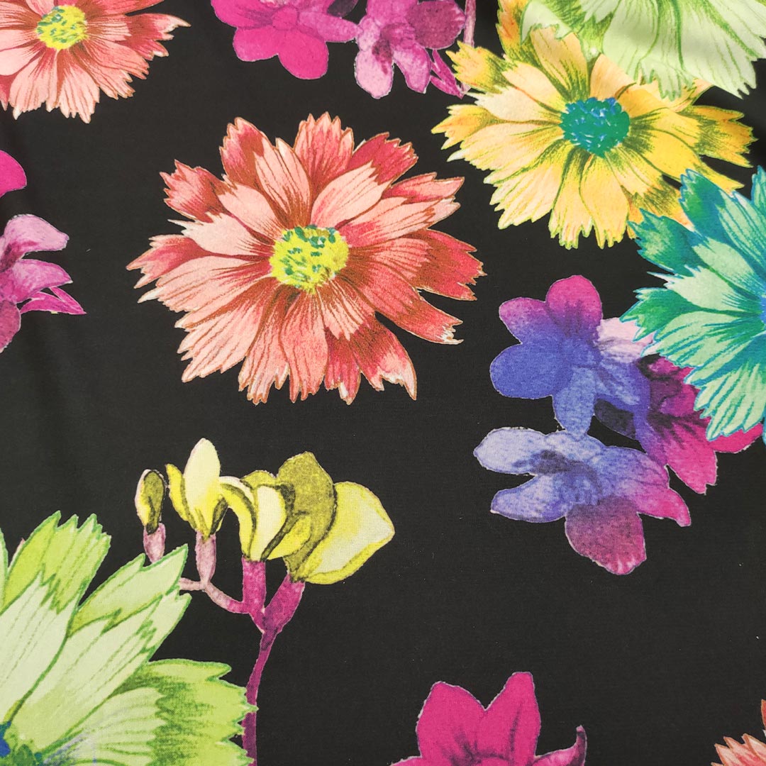 Tessuto Cady elasticizzato a fantasia motivo floreale nero – lime – fucsia – giallo