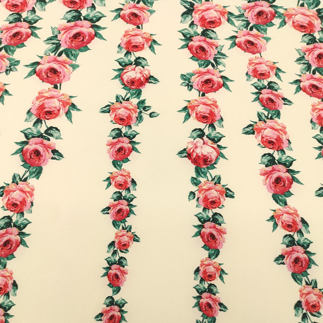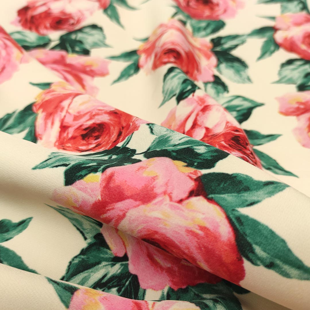 Tessuto Cady elasticizzato a fantasia motivo floreale panna – verde – rosa – rosso