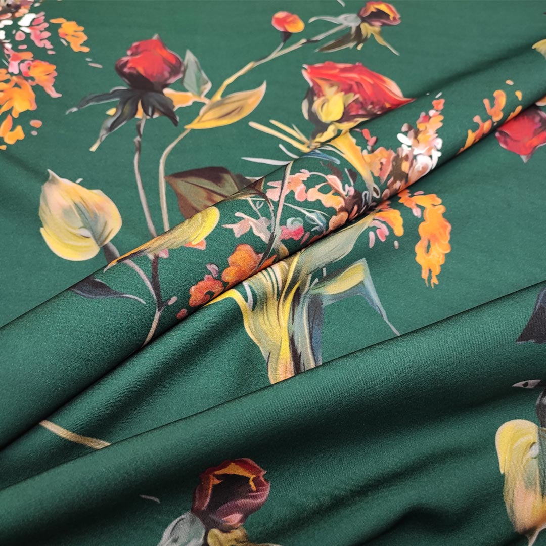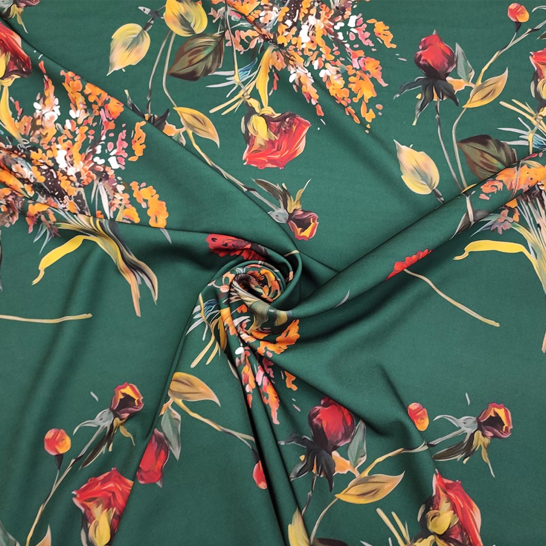 Tessuto Cady elasticizzato a fantasia motivo floreale verde bottiglia – senape – ruggine