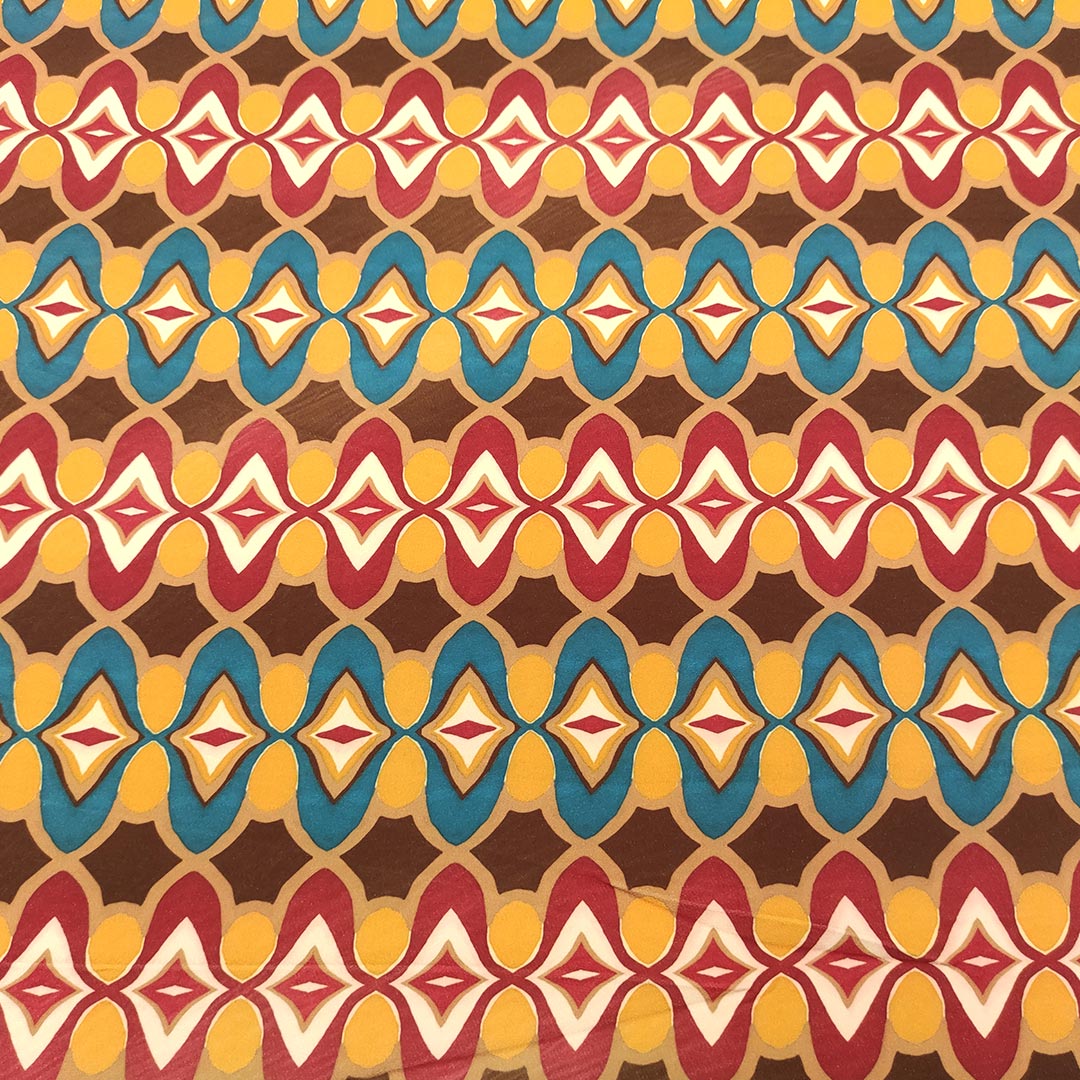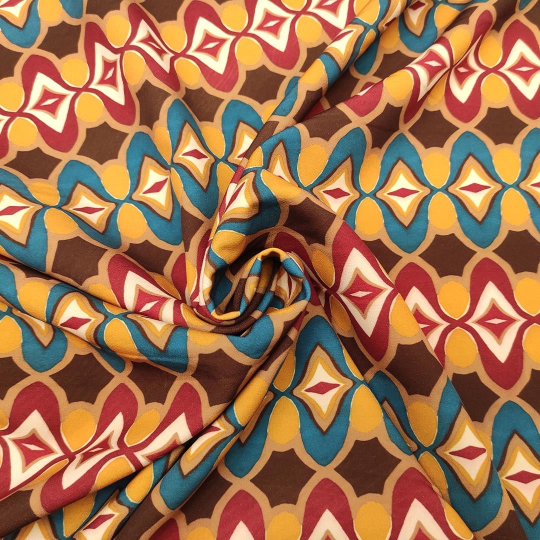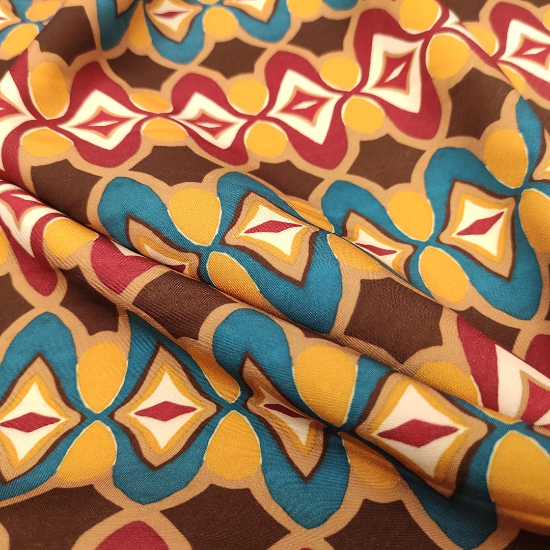 Tessuto Cady elasticizzato a fantasia motivo geometrico bordeaux – ocra – verde ottanio