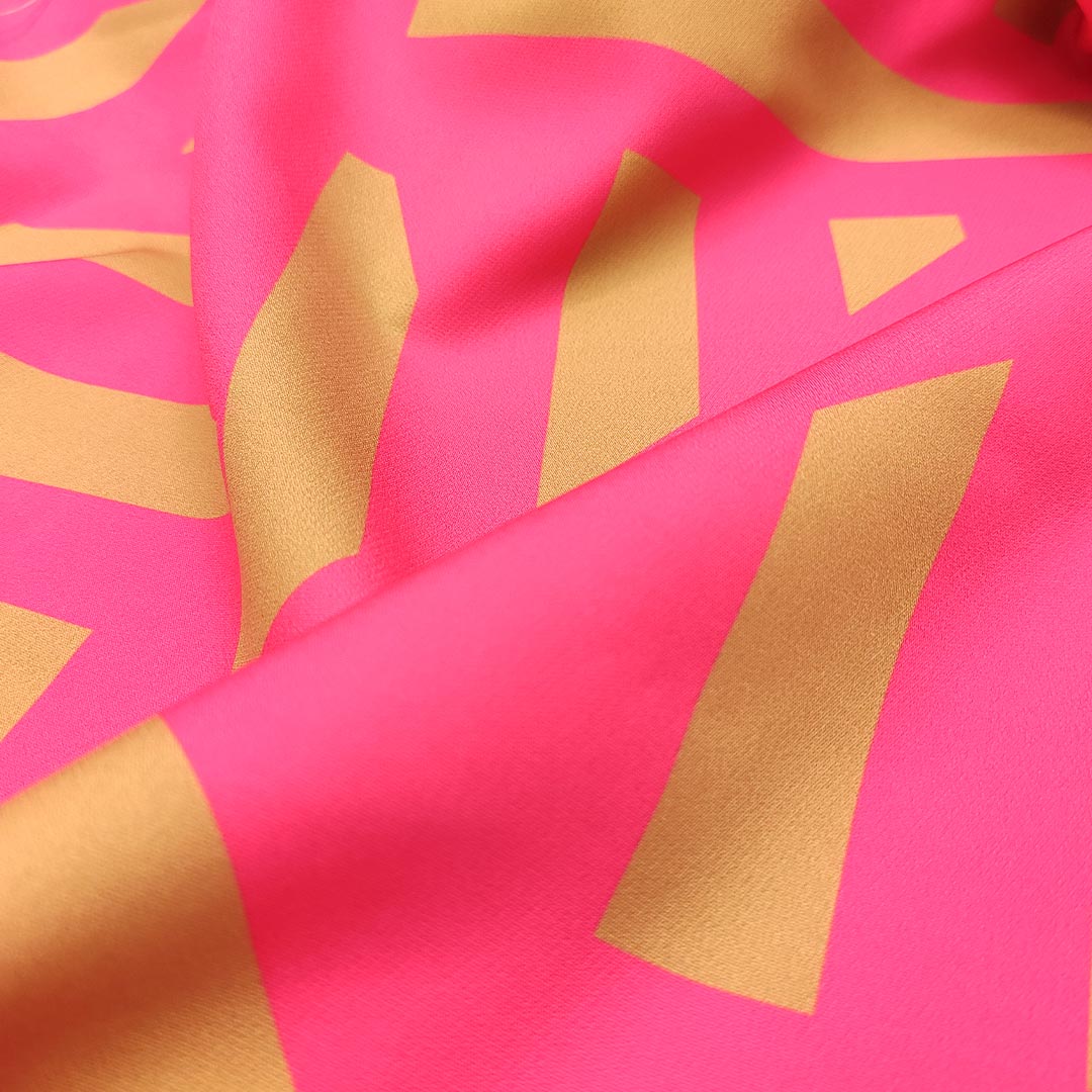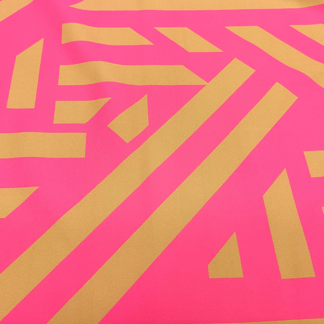 Tessuto Cady elasticizzato a fantasia motivo geometrico fucsia – tabacco