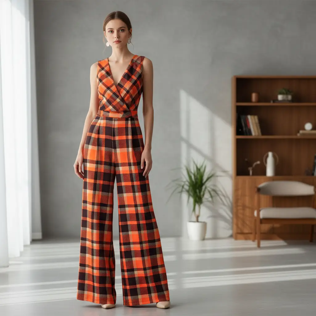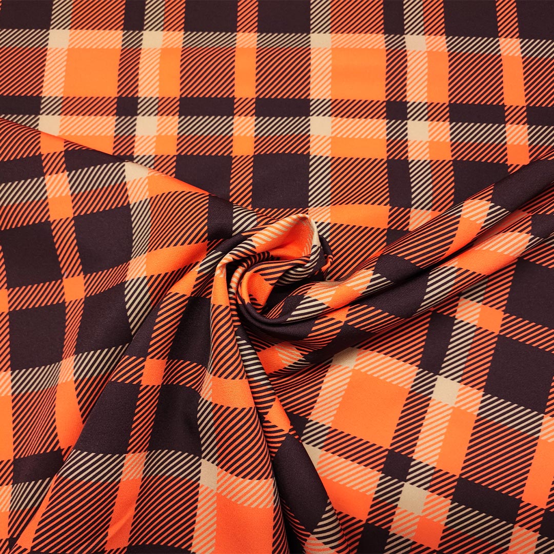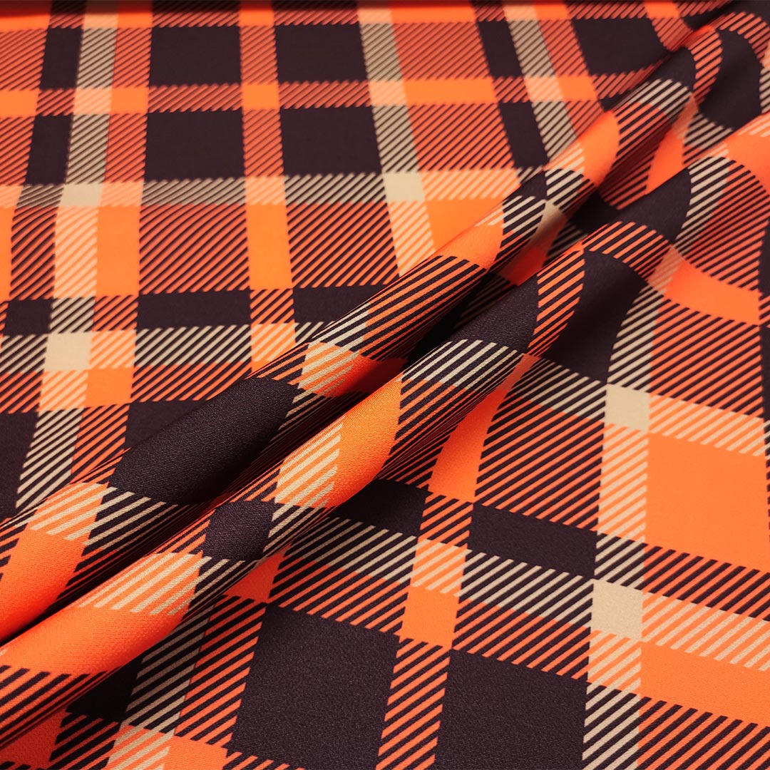 Tessuto Cady elasticizzato a fantasia motivo quadri arancio – marrone – beige