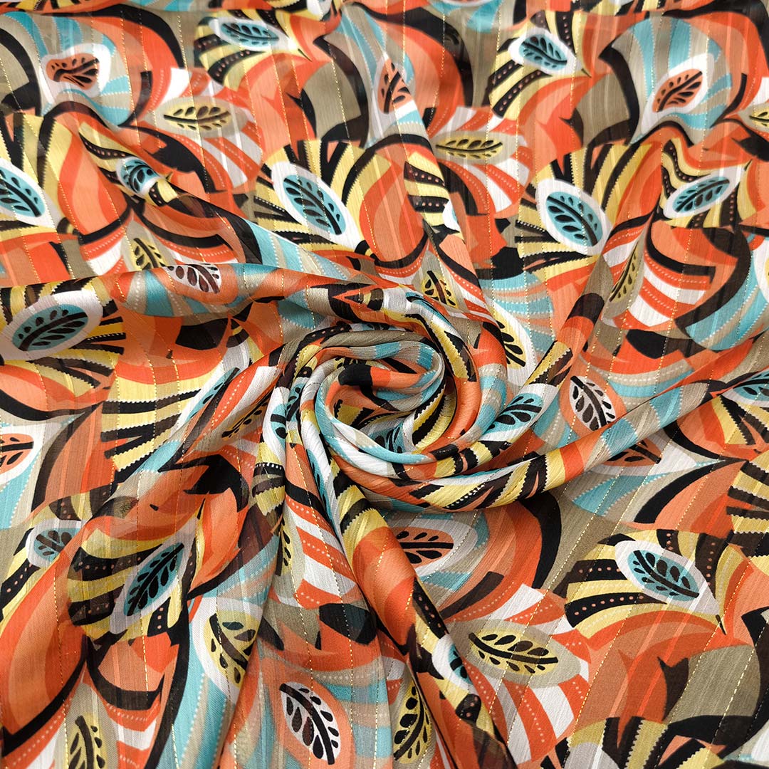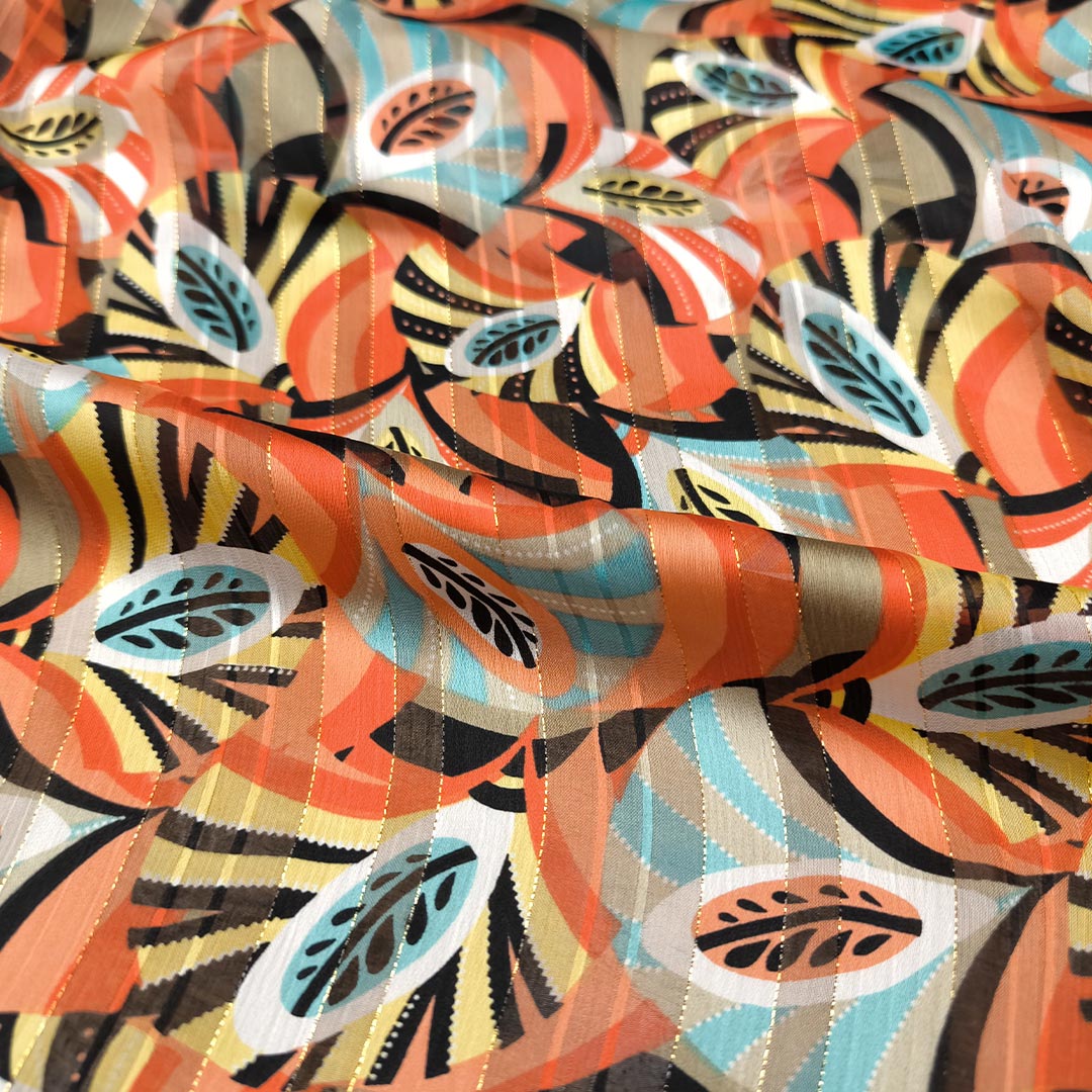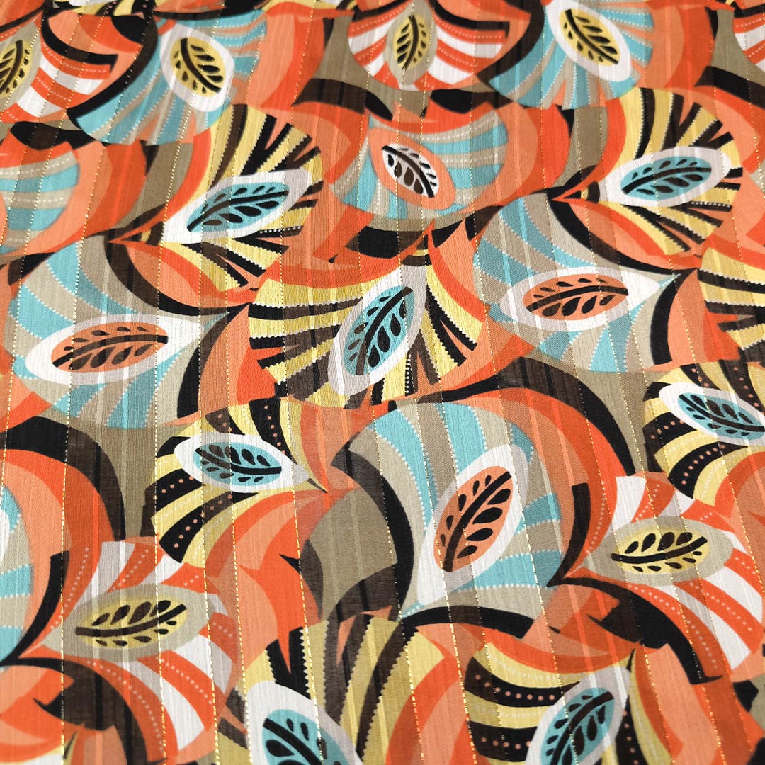 Tessuto Chiffon a fantasia con filo lurex motivo astratto corallo – nero – tiffany – giallo