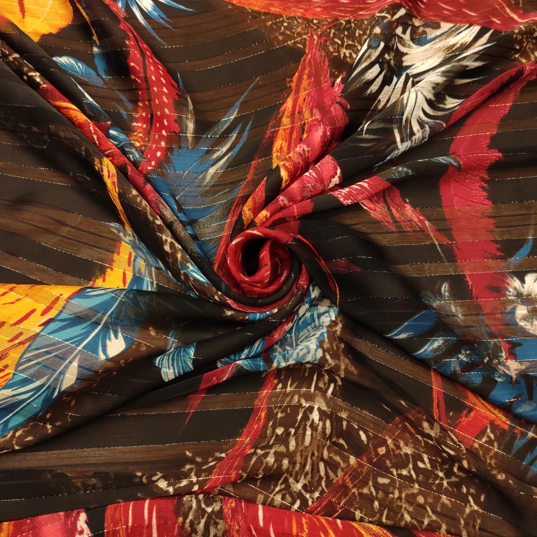 Tessuto Chiffon a fantasia con filo lurex dalla mano morbida trasparente e setosa, ideale per realizzare capi morbidi e trasparenti da cerimonia o da usare tutti i giorni come: camicie, abiti, gonne, stole e spolverini.