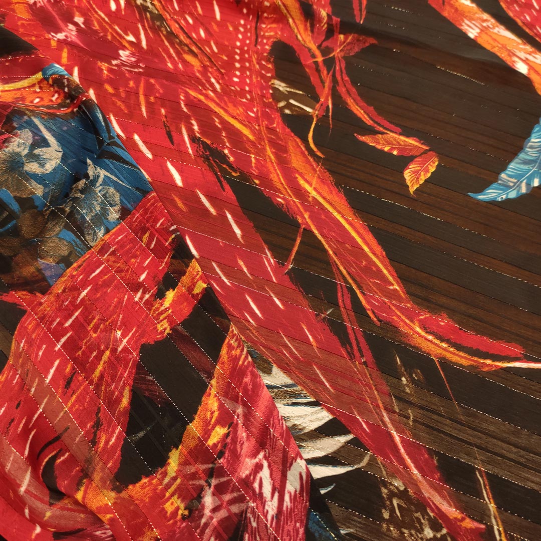 Tessuto Chiffon a fantasia con filo lurex motivo astratto nero – rosso – avio