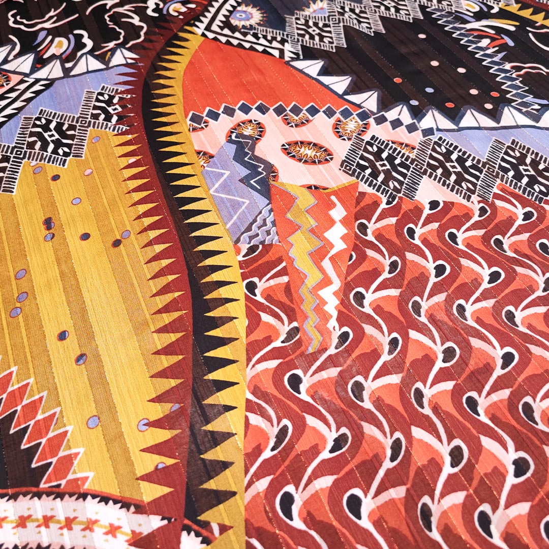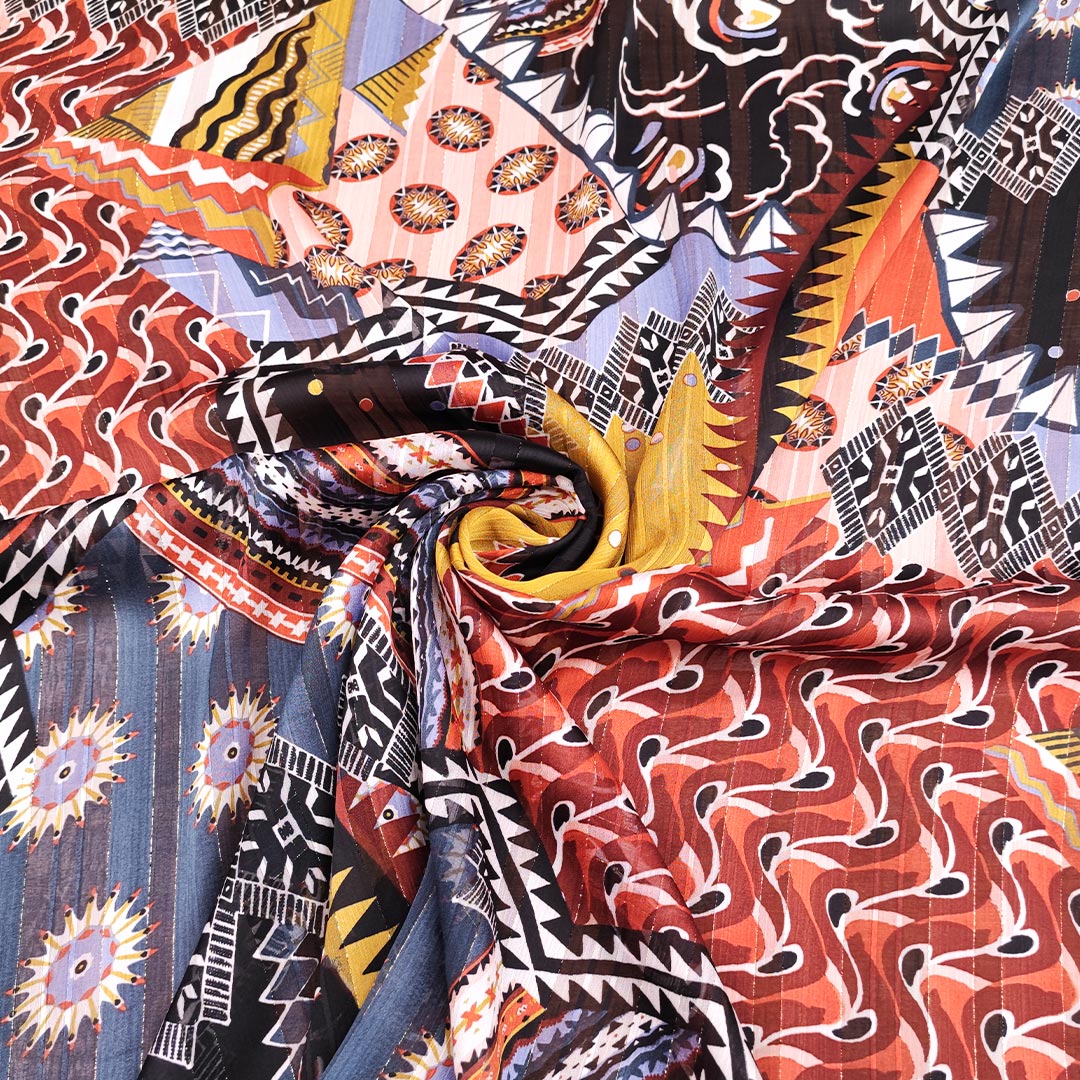 Tessuto Chiffon a fantasia con filo lurex motivo astratto rosa – ocra – very peri