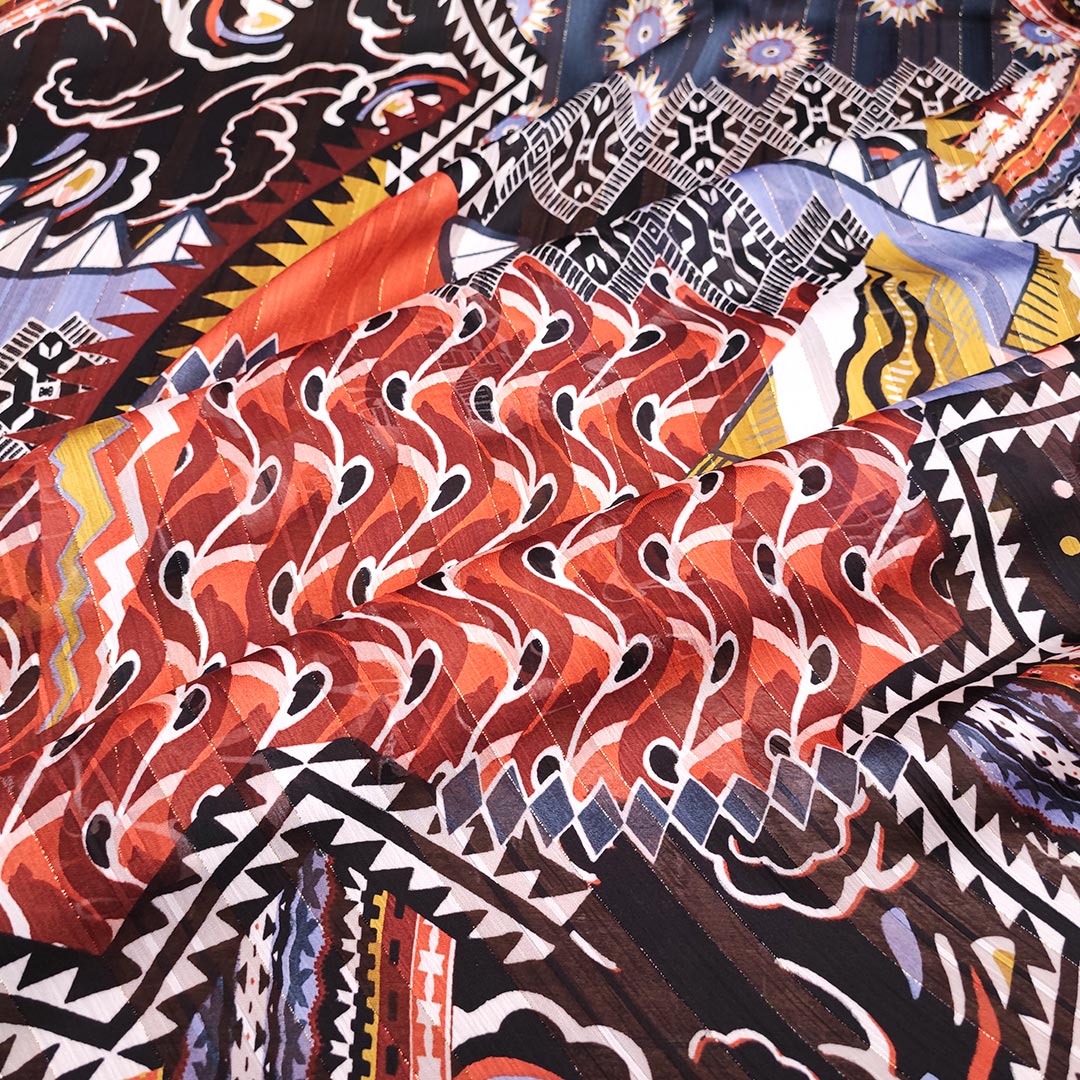Tessuto Chiffon a fantasia con filo lurex dalla mano morbida trasparente e setosa, ideale per realizzare capi morbidi e trasparenti da cerimonia o da usare tutti i giorni come: camicie, abiti, gonne, stole e spolverini.
