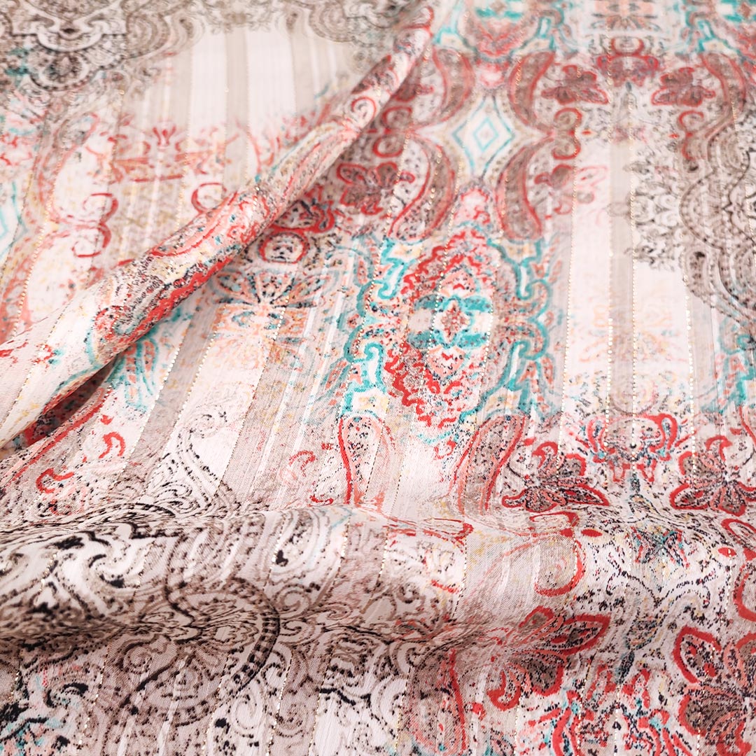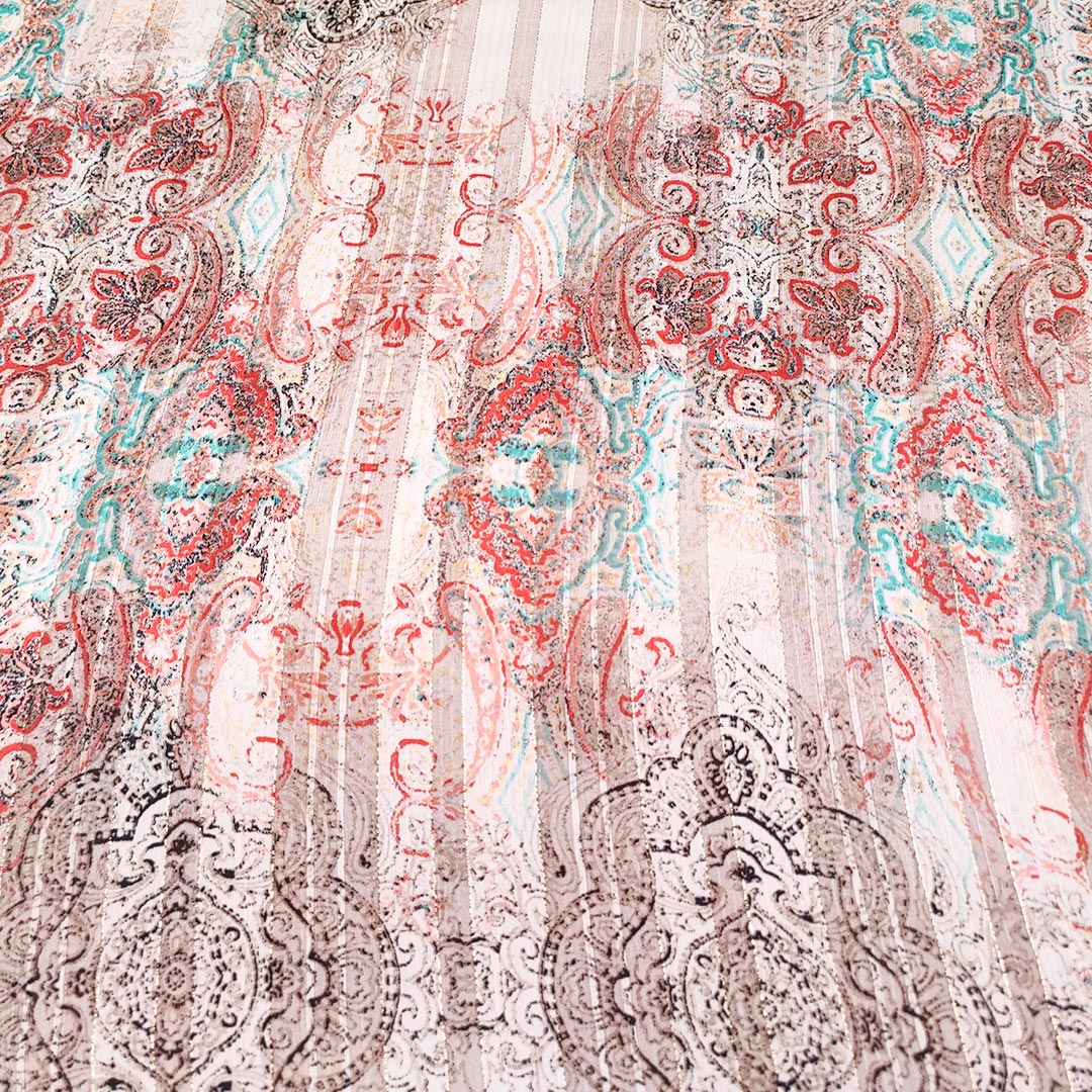 Tessuto Chiffon a fantasia con filo lurex motivo floreale barocco panna – rosso – tiffany