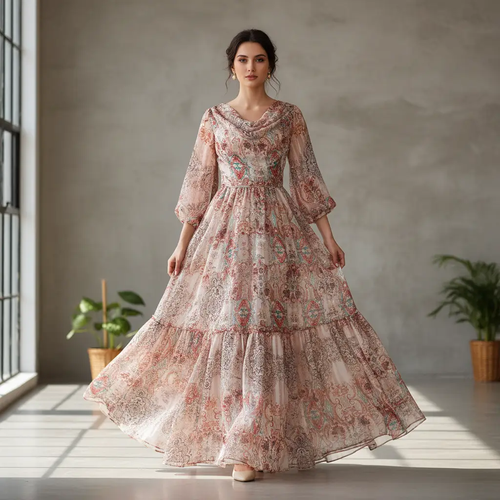 Tessuto Chiffon a fantasia con filo lurex dalla mano morbida trasparente e setosa, ideale per realizzare capi morbidi e trasparenti da cerimonia o da usare tutti i giorni come: camicie, abiti, gonne, stole e spolverini.