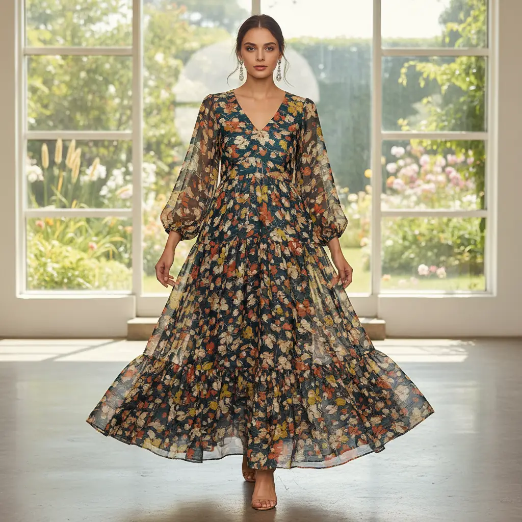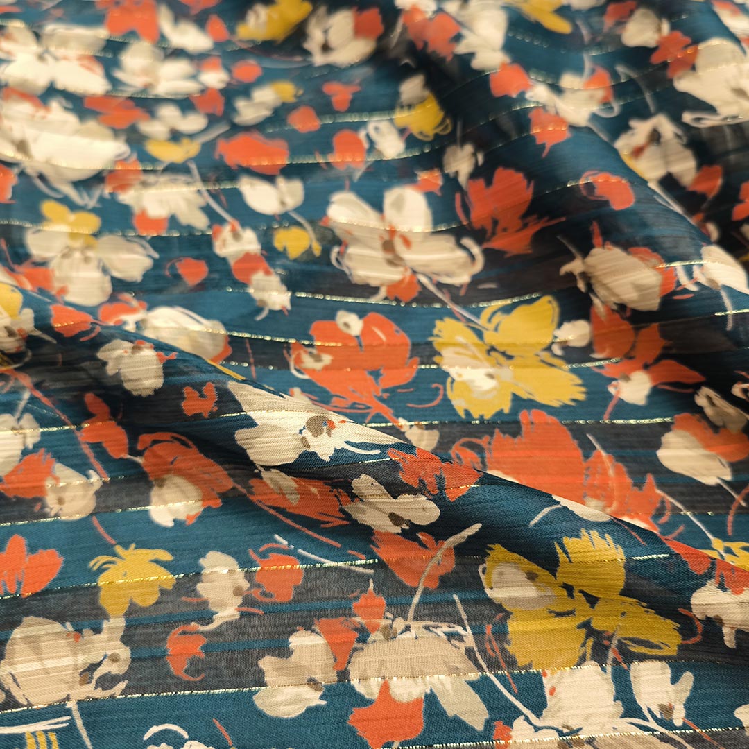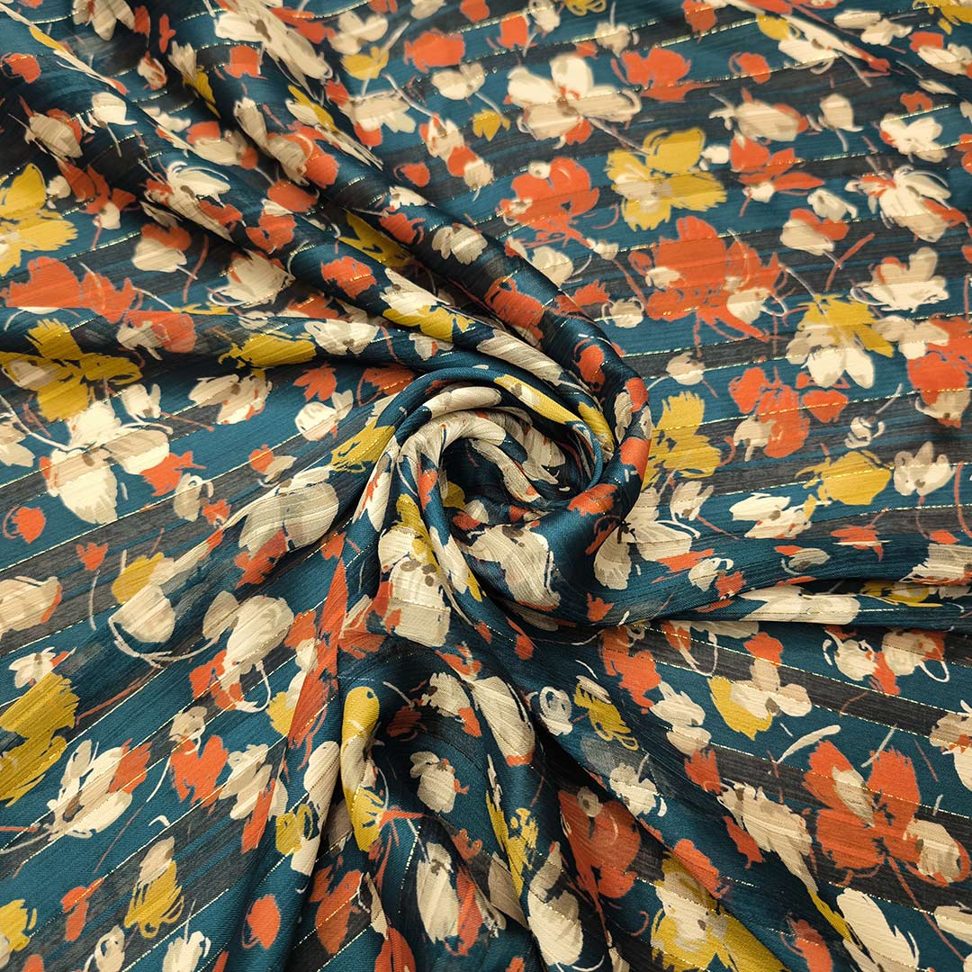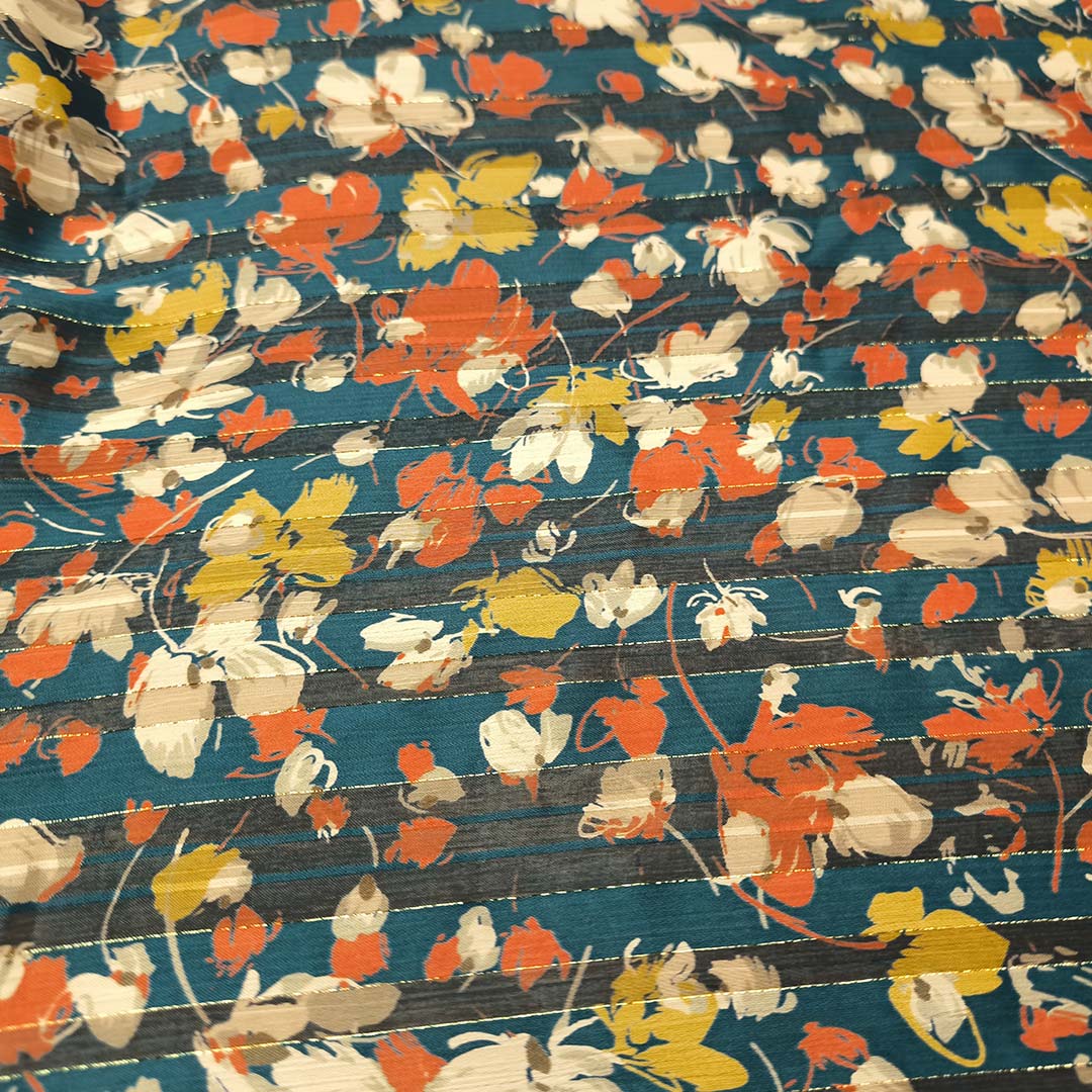 Tessuto Chiffon a fantasia con filo lurex motivo floreale ottanio – coccio – ocra