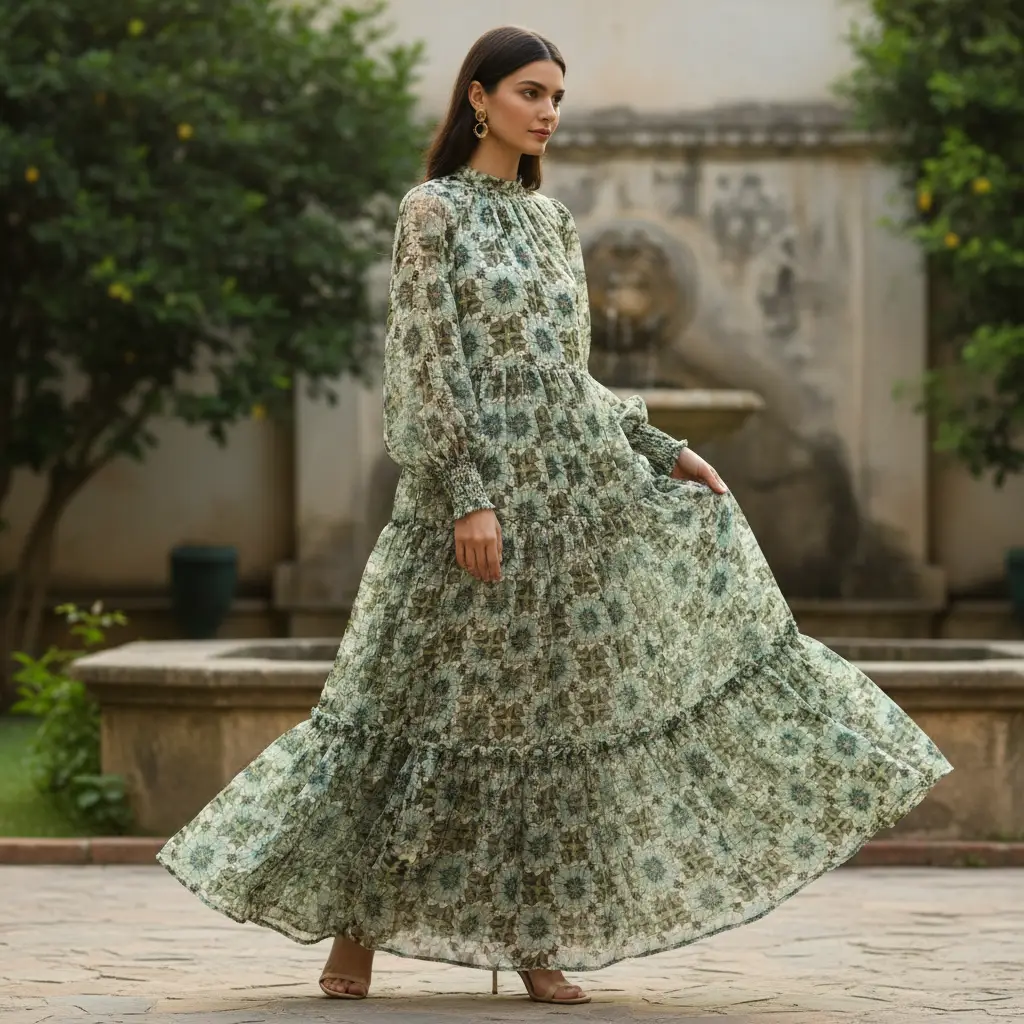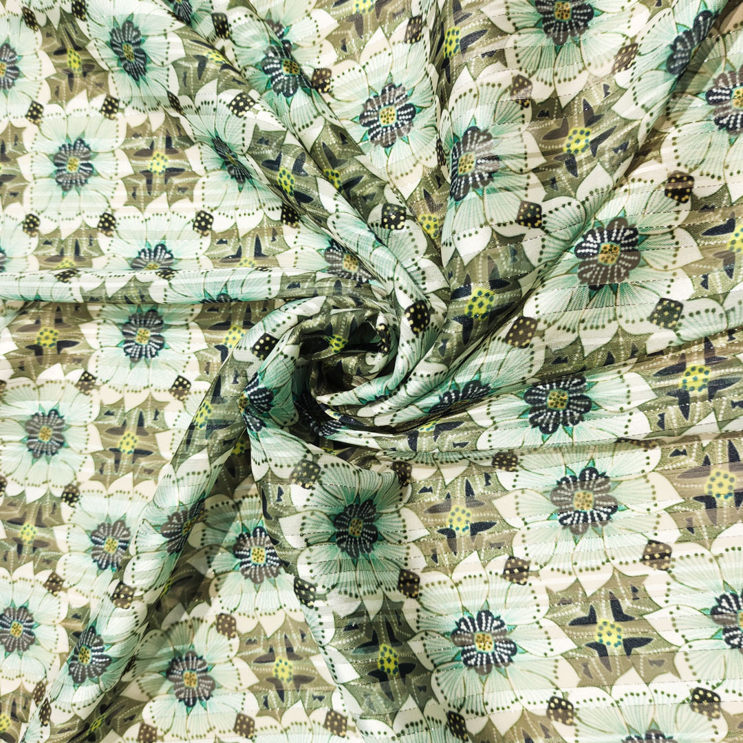Tessuto Chiffon a fantasia con filo lurex motivo floreale verde salvia – verde militare – panna