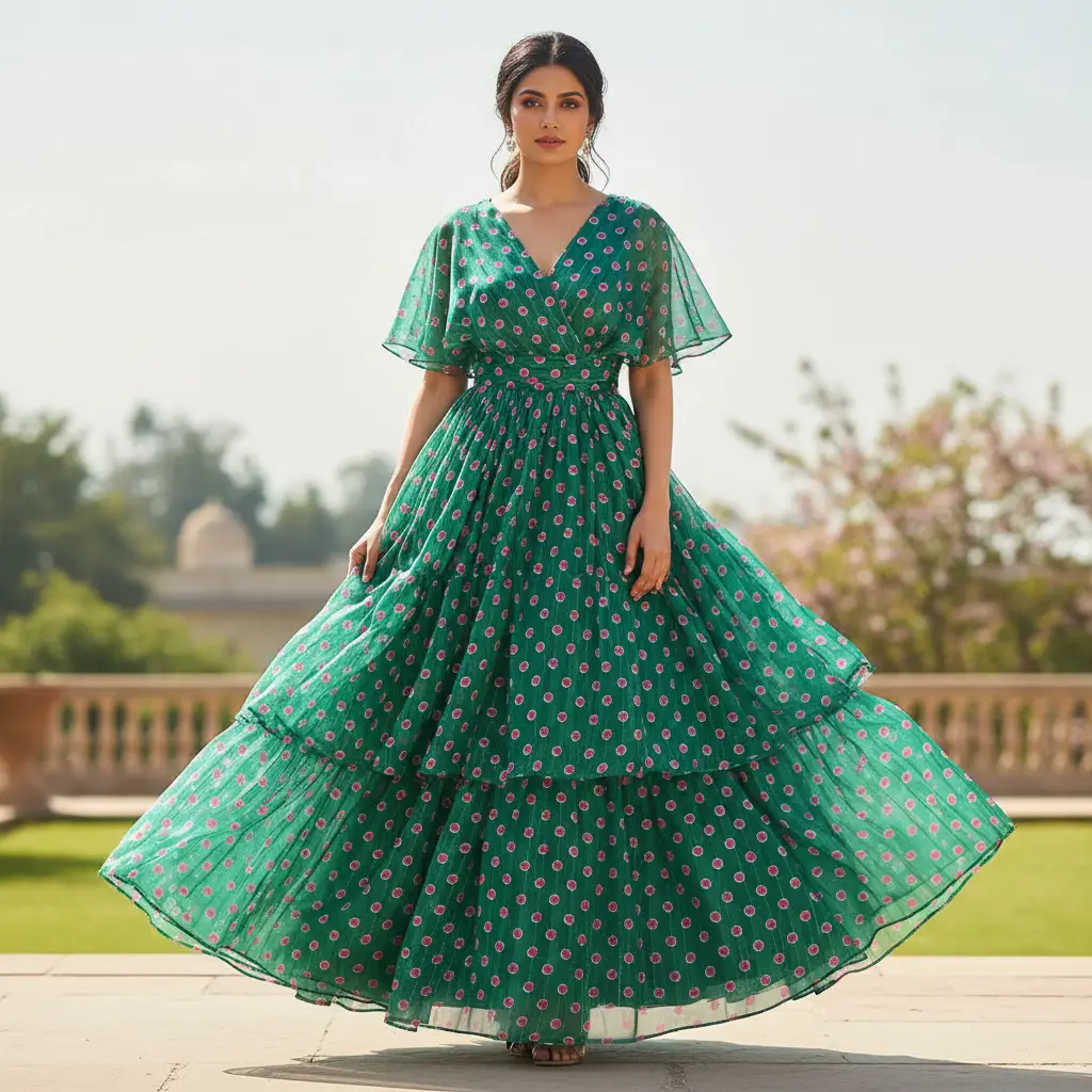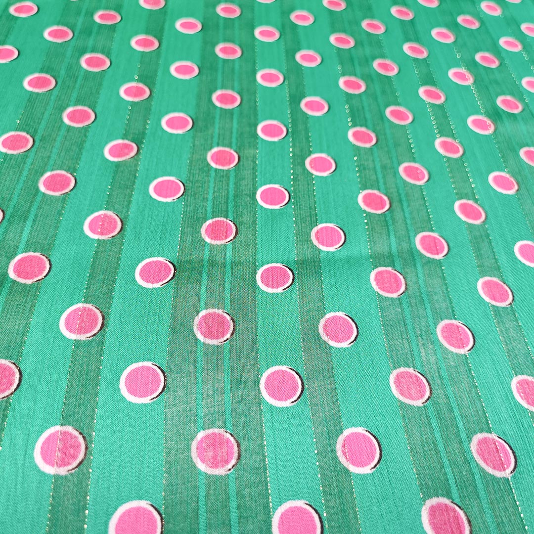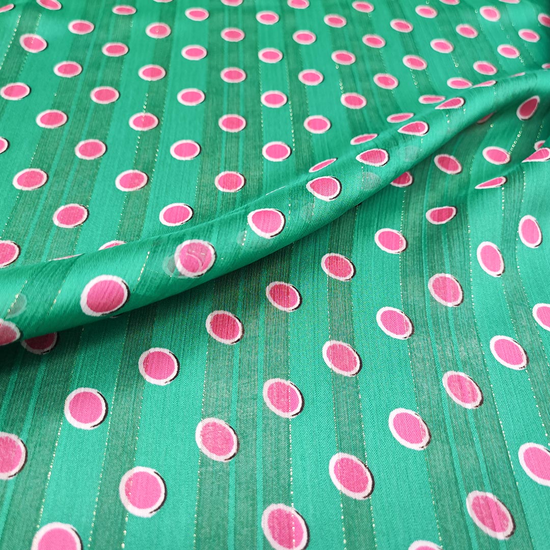 Tessuto Chiffon a fantasia con filo lurex motivo pois verde smeraldo – fucsia