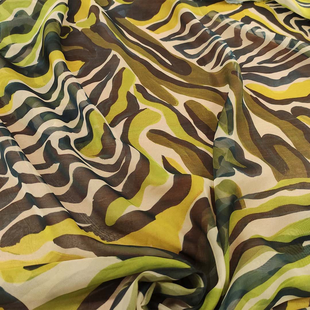 Tessuto Chiffon a fantasia motivo animalier nero – verde acido – verde militare