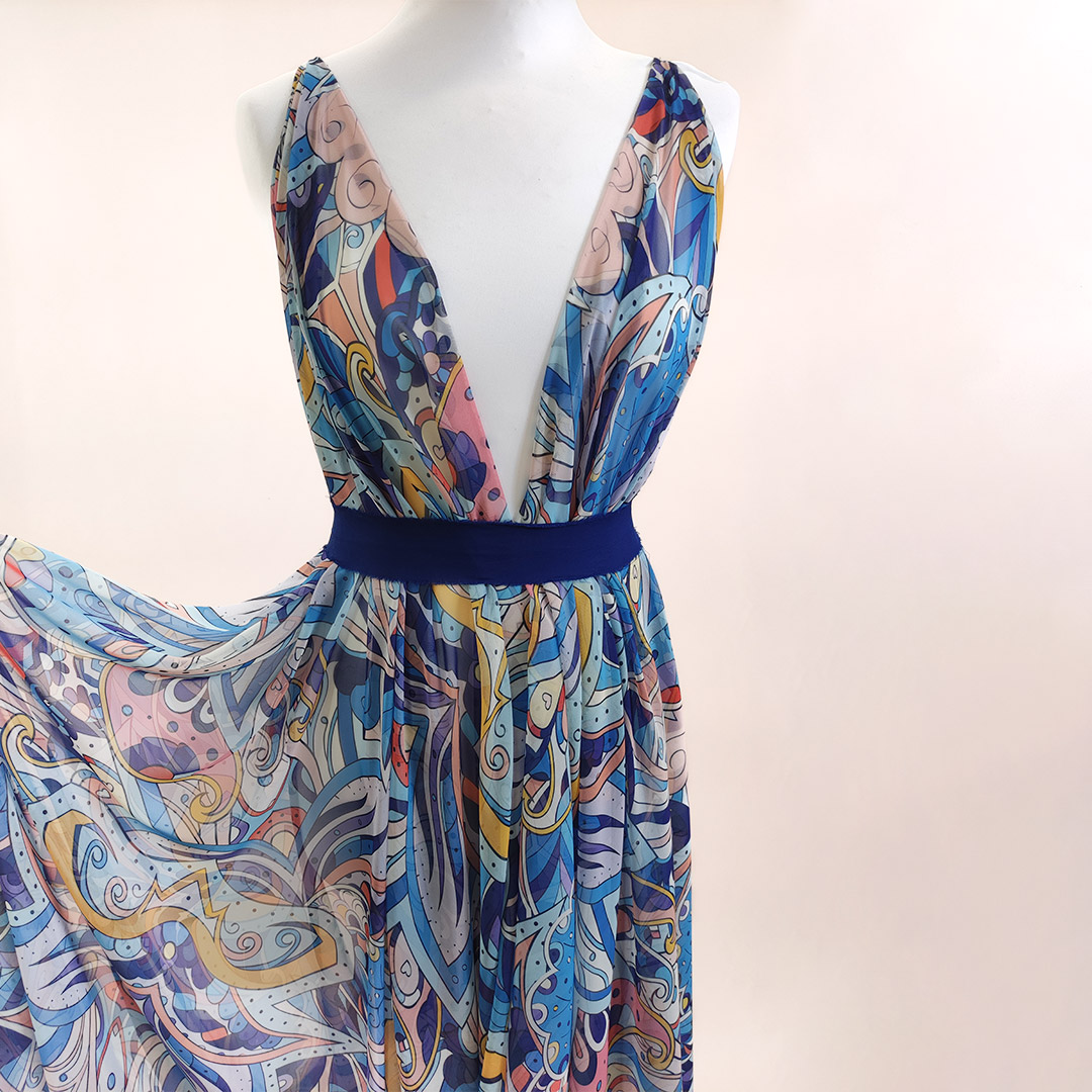 Tessuto Chiffon a fantasia motivo astratto azzurro – celeste – rosa