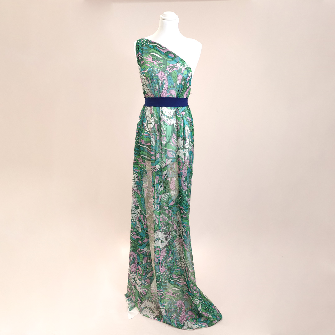Tessuto Chiffon a fantasia dalla mano morbida trasparente e setosa, ideale per realizzare capi morbidi e trasparenti da cerimonia o da usare tutti i giorni come: camicie, abiti, gonne, stole e spolverini. Selezione Iaia Collection