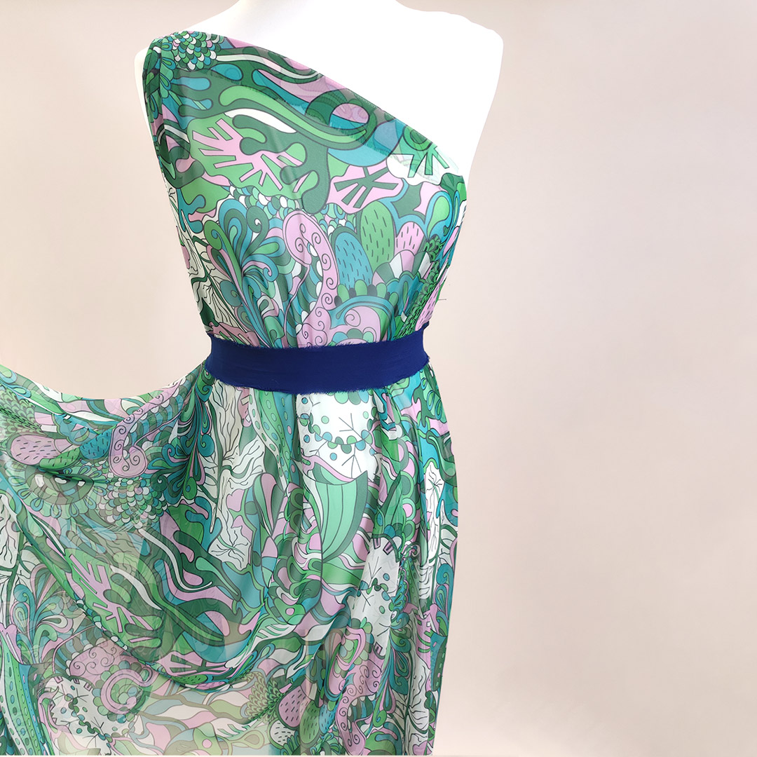 Tessuto Chiffon a fantasia motivo astratto verde prato – rosa