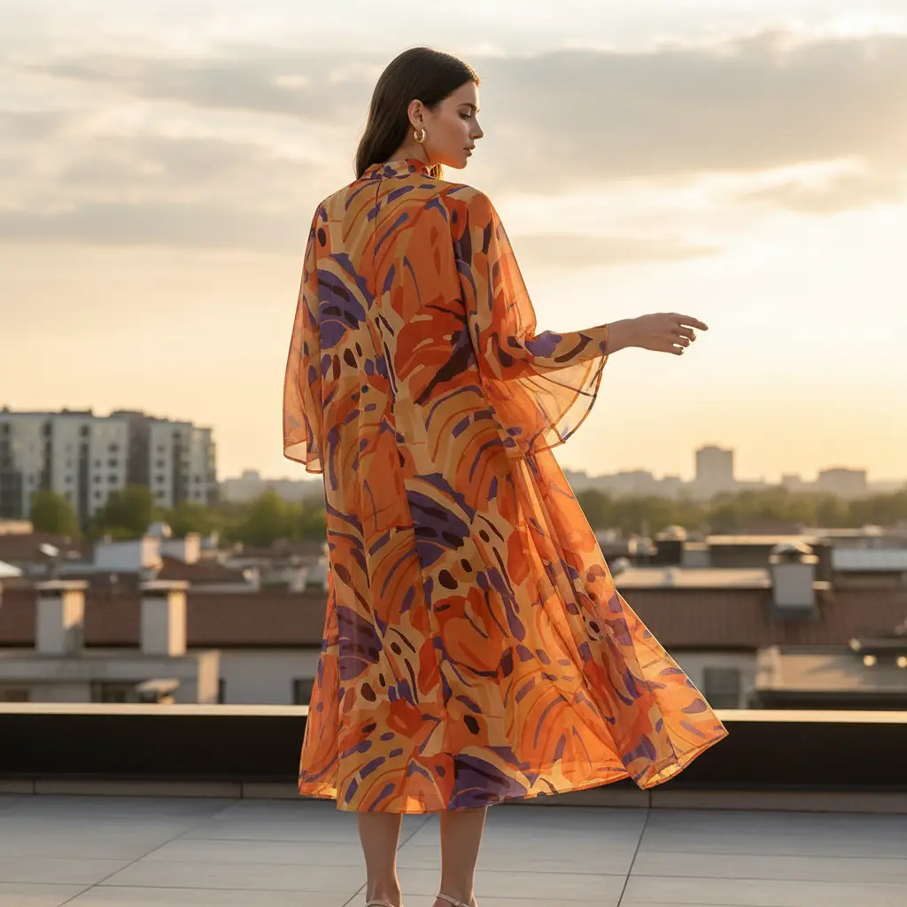 Tessuto Chiffon a fantasia dalla mano morbida trasparente e setosa, ideale per realizzare capi morbidi e trasparenti da cerimonia o da usare tutti i giorni come: camicie, abiti, gonne, stole e spolverini.
