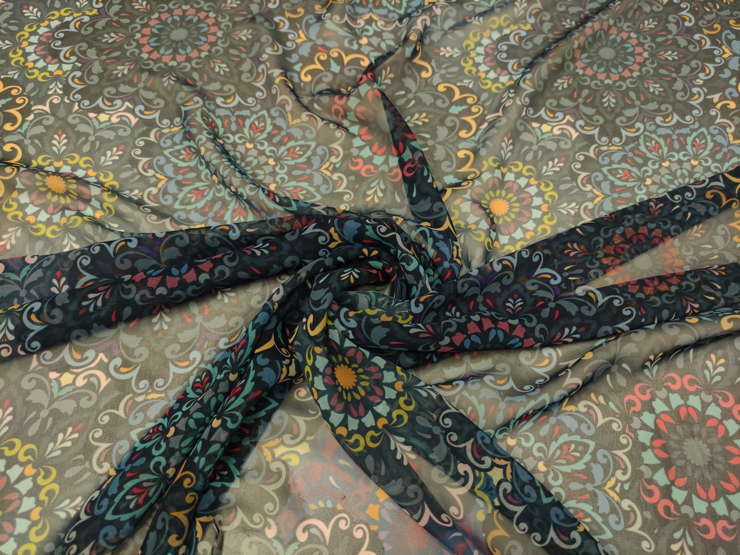 Tessuto Chiffon a fantasia dalla mano morbida trasparente e setosa, ideale per realizzare capi morbidi e trasparenti da cerimonia o da usare tutti i giorni come: camicie, abiti, gonne, stole e spolverini. Selezione Iaia Collection