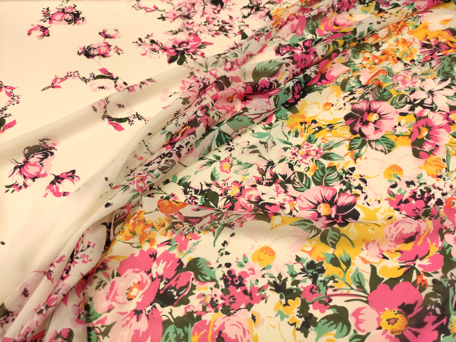 Tessuto Chiffon a fantasia dalla mano morbida trasparente e setosa, ideale per realizzare capi morbidi e trasparenti da cerimonia o da usare tutti i giorni come: camicie, abiti, gonne, stole e spolverini. Selezione Iaia Collection