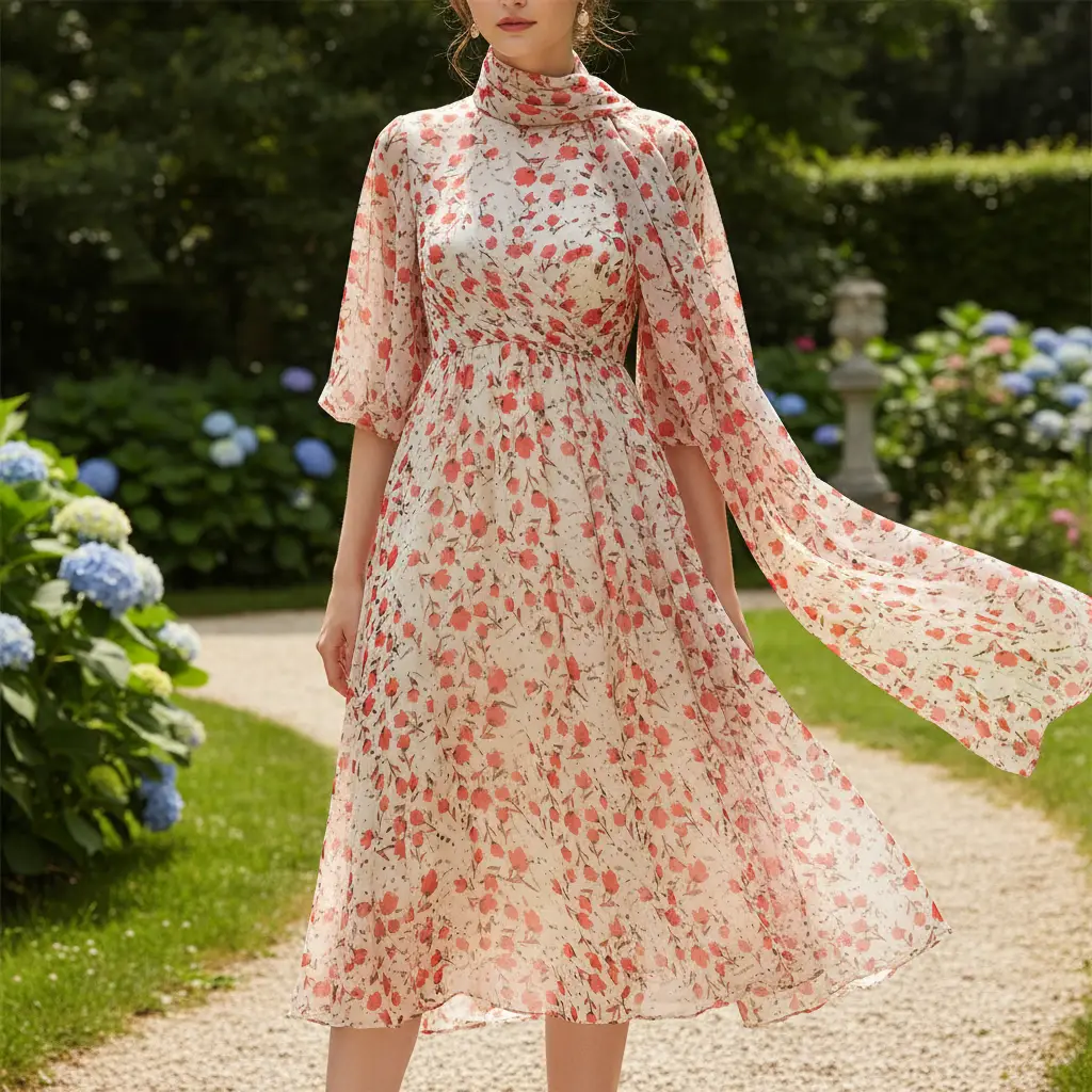 Tessuto Chiffon a fantasia motivo floreale bianco – rosso