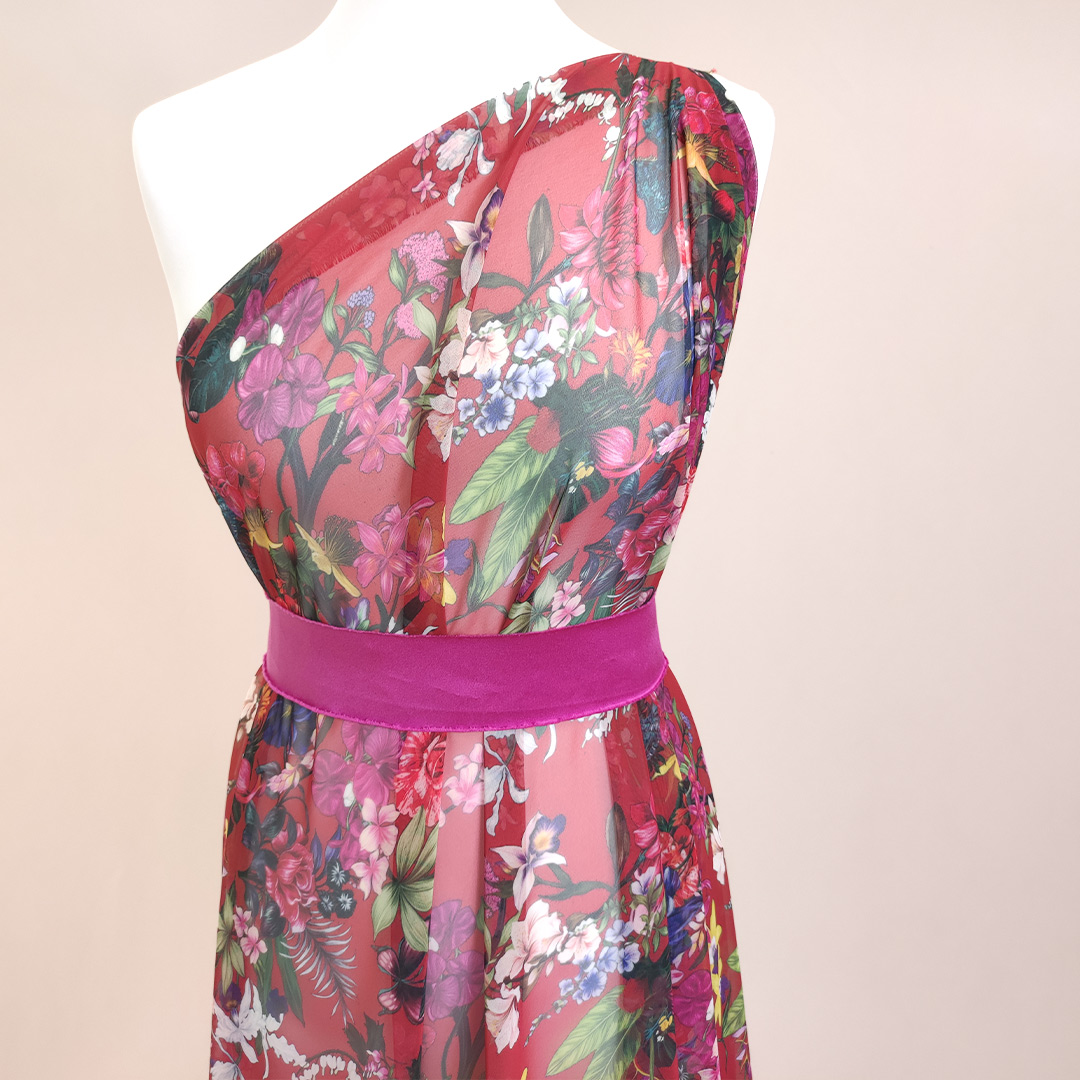 Tessuto Chiffon a fantasia motivo floreale rosso – blu – verde