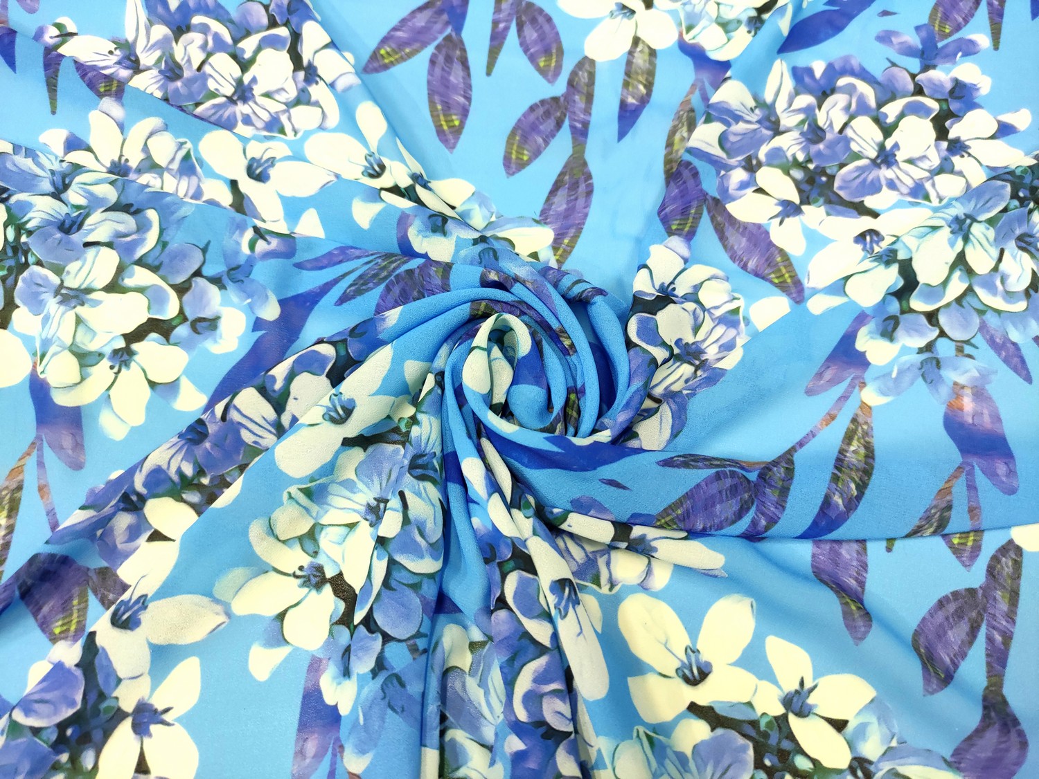 Tessuto Chiffon a fantasia motivo floreale turchese – bianco