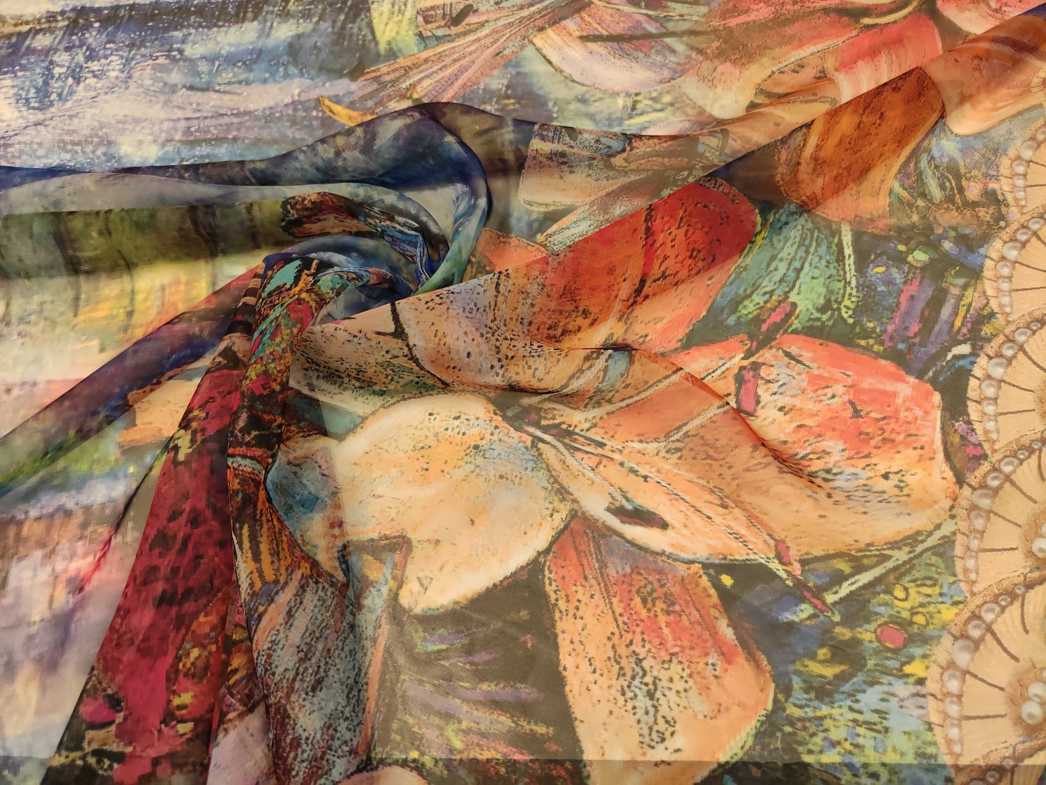 Tessuto Chiffon a fantasia dalla mano morbida trasparente e setosa, ideale per realizzare capi morbidi e trasparenti da cerimonia o da usare tutti i giorni come: camicie, abiti, gonne, stole e spolverini. Selezione Iaia Collection