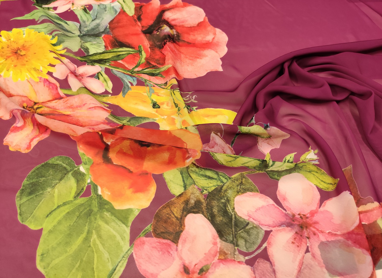 Tessuto Chiffon a fantasia motivo floreale vinaccio – rosso