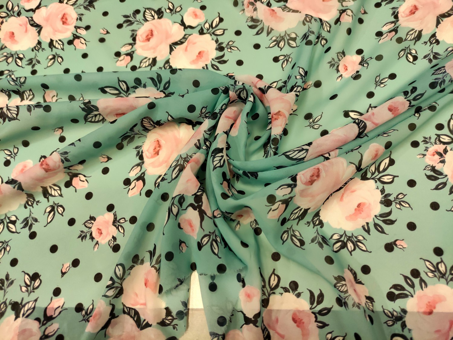 Tessuto Chiffon a fantasia dalla mano morbida trasparente e setosa, ideale per realizzare capi morbidi e trasparenti da cerimonia o da usare tutti i giorni come: camicie, abiti, gonne, stole e spolverini. Selezione Iaia Collection