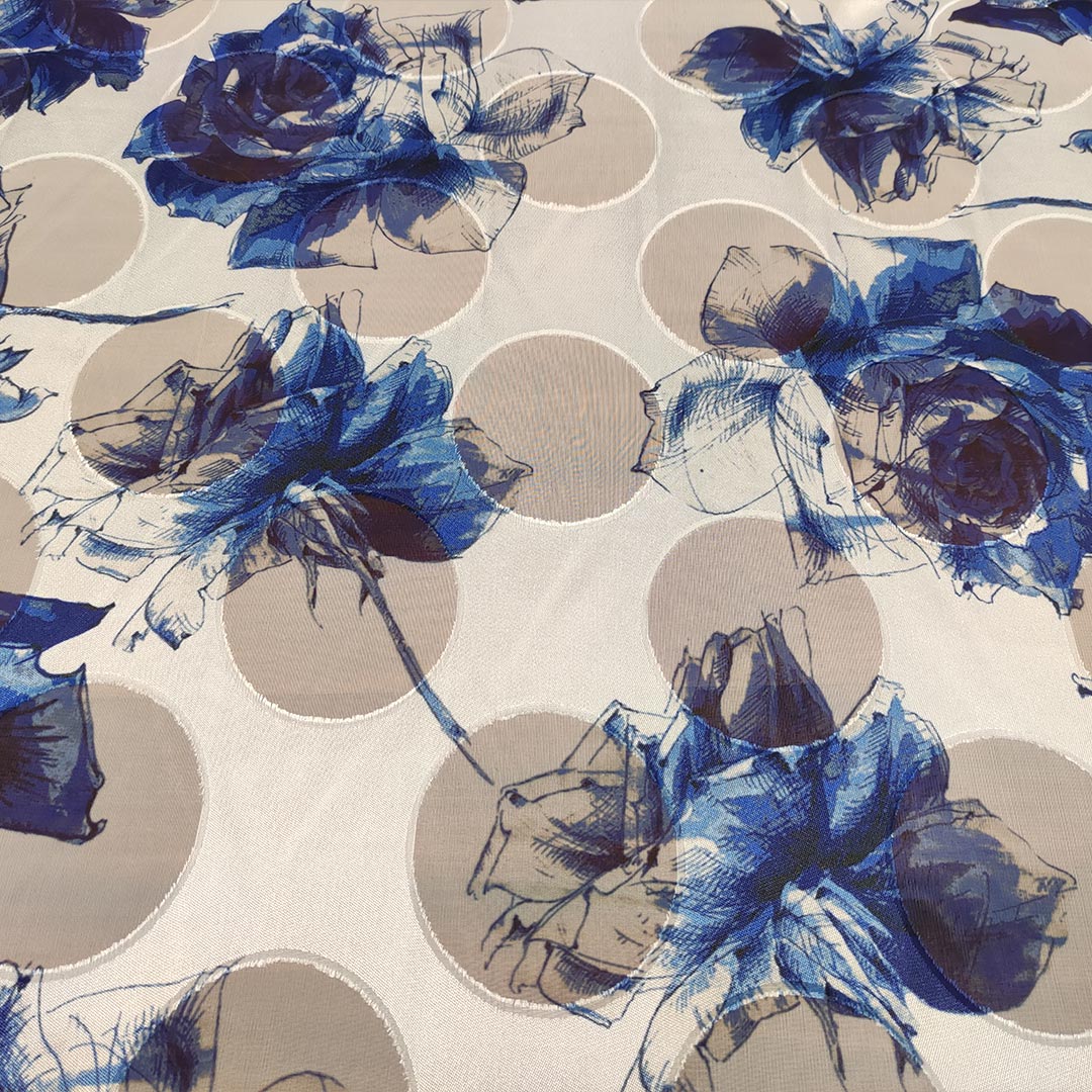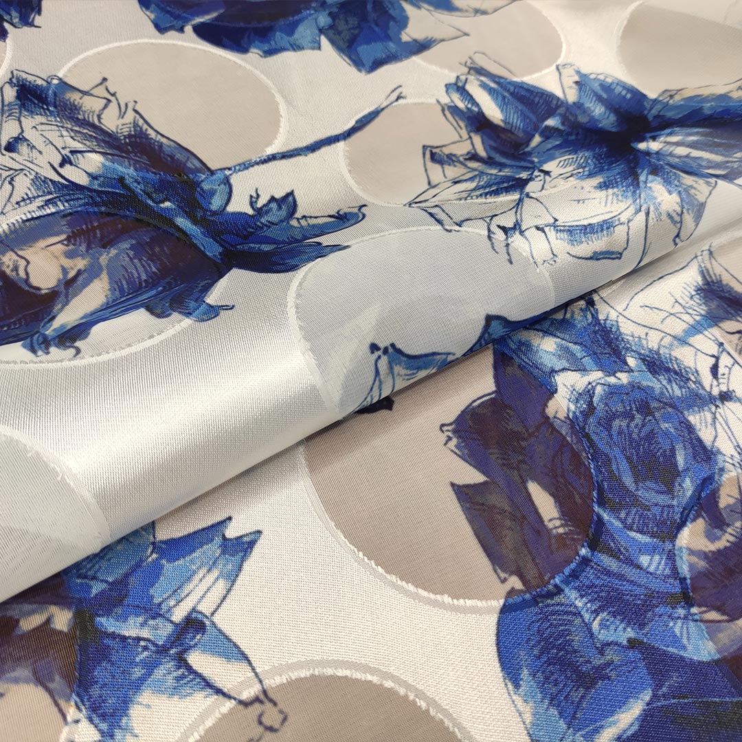 Tessuto Chiffon devorè motivo floreale blue royale – bianco