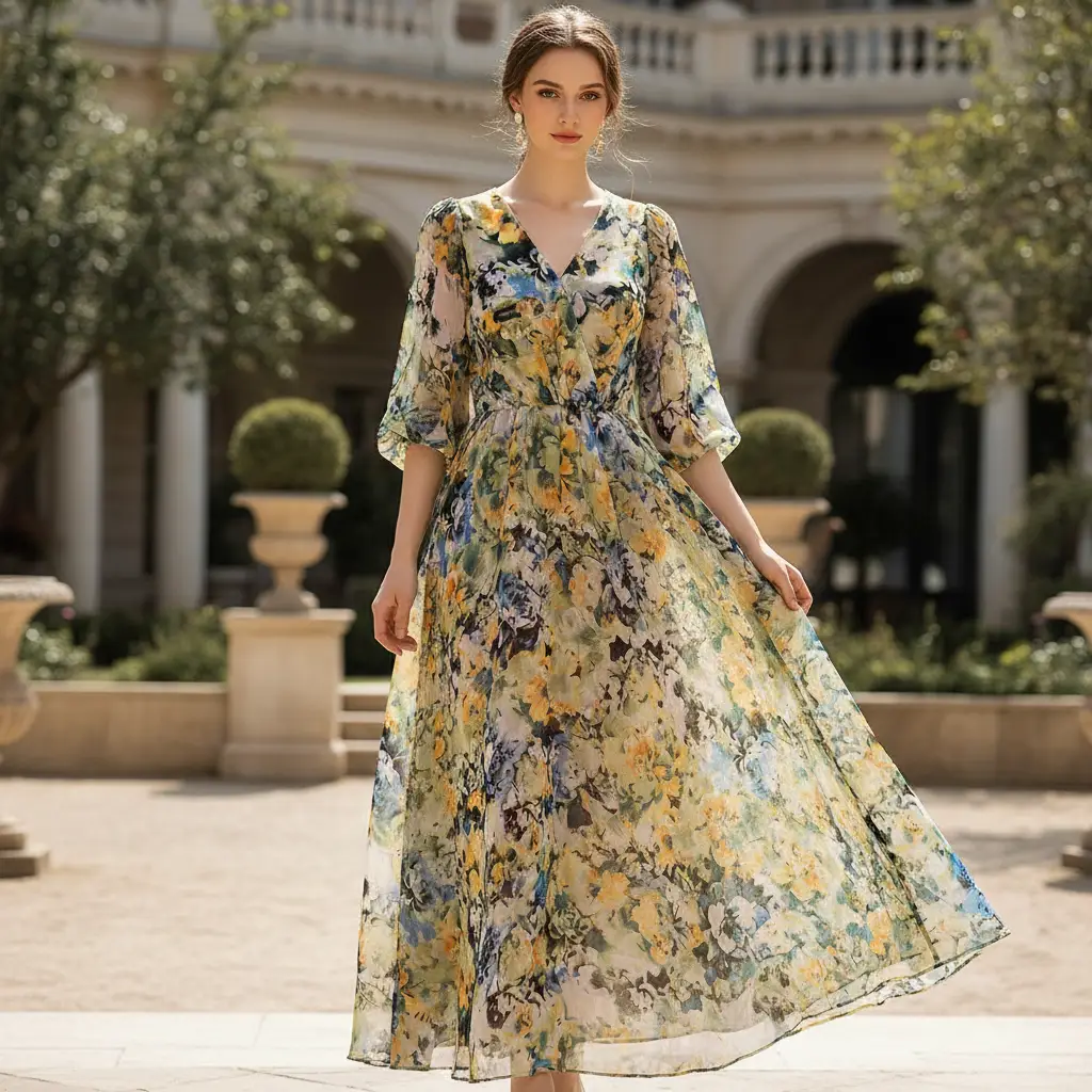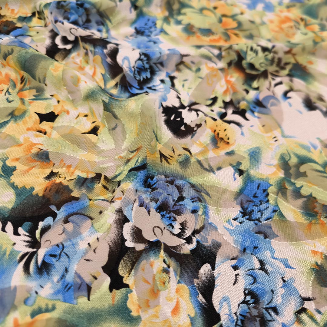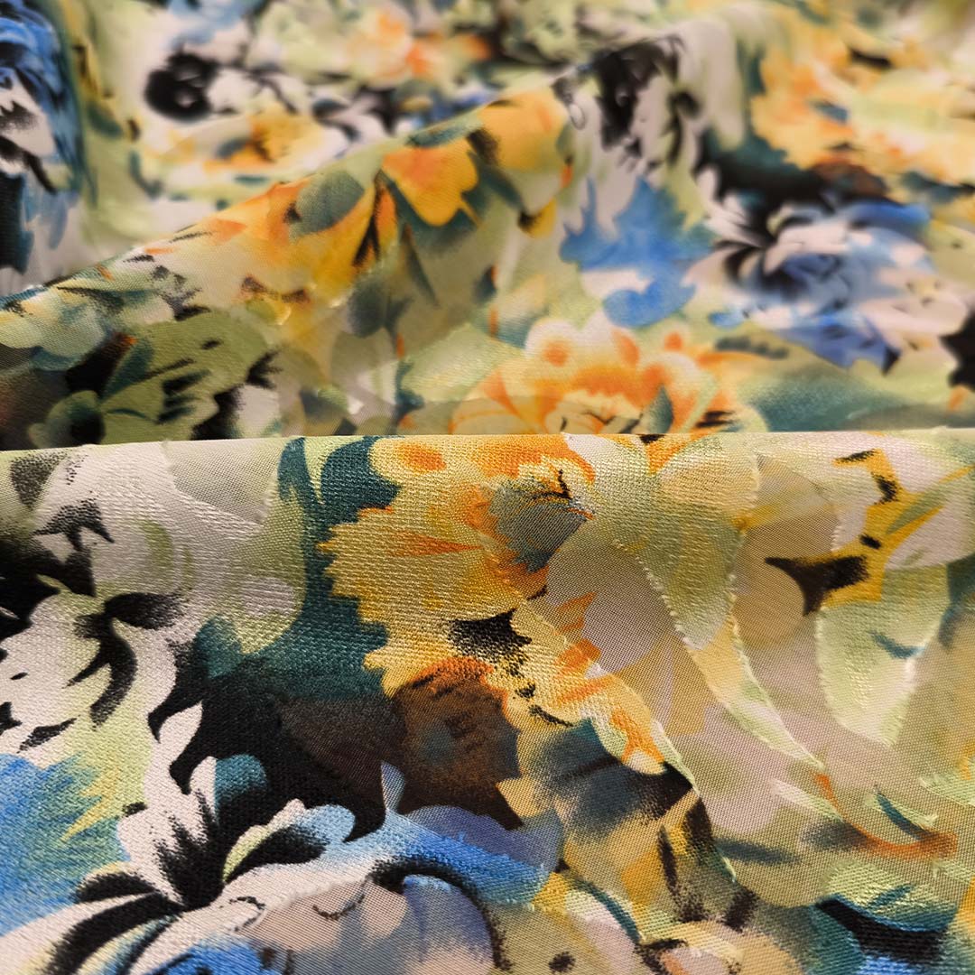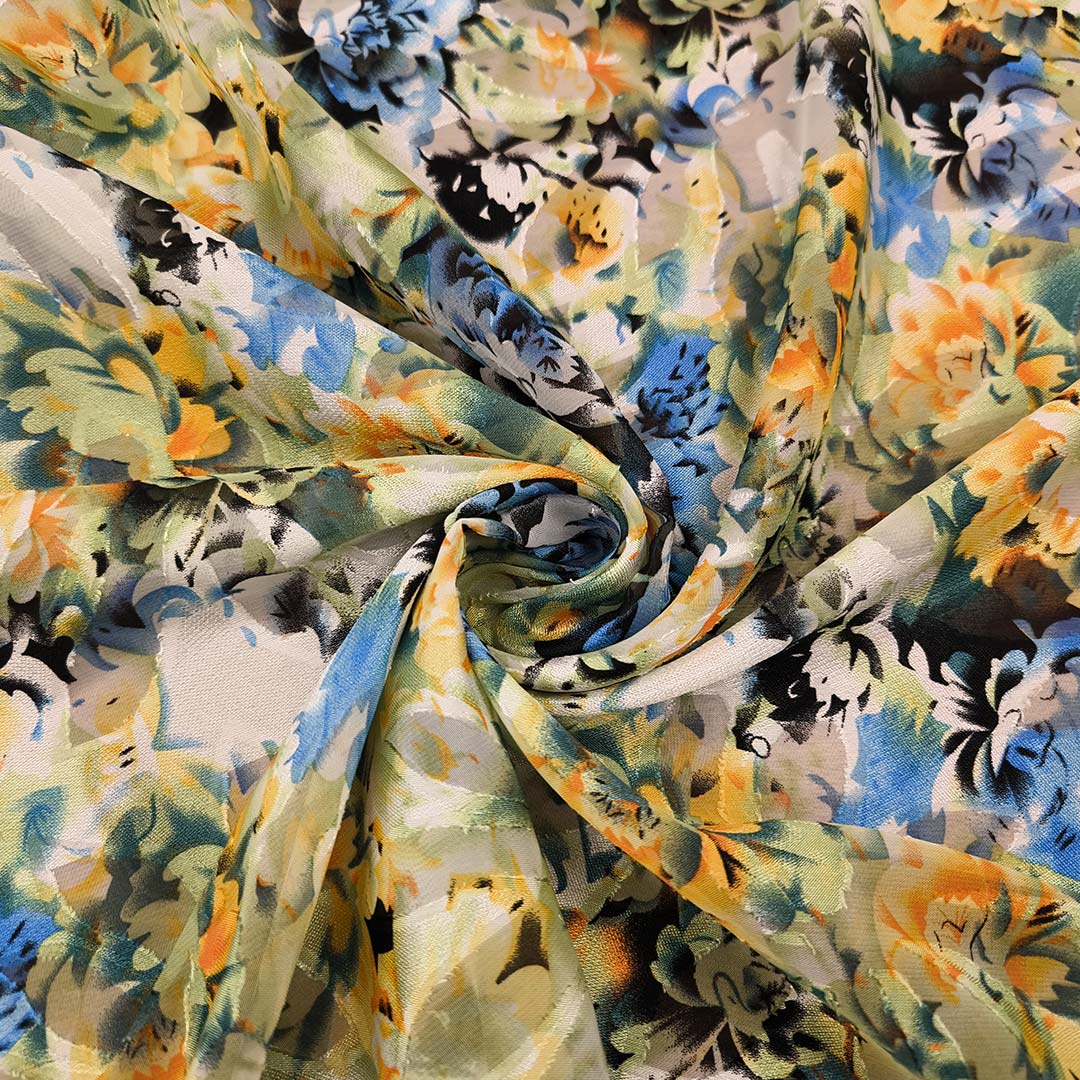 Tessuto Chiffon devorè motivo floreale giallo – turchese – bianco