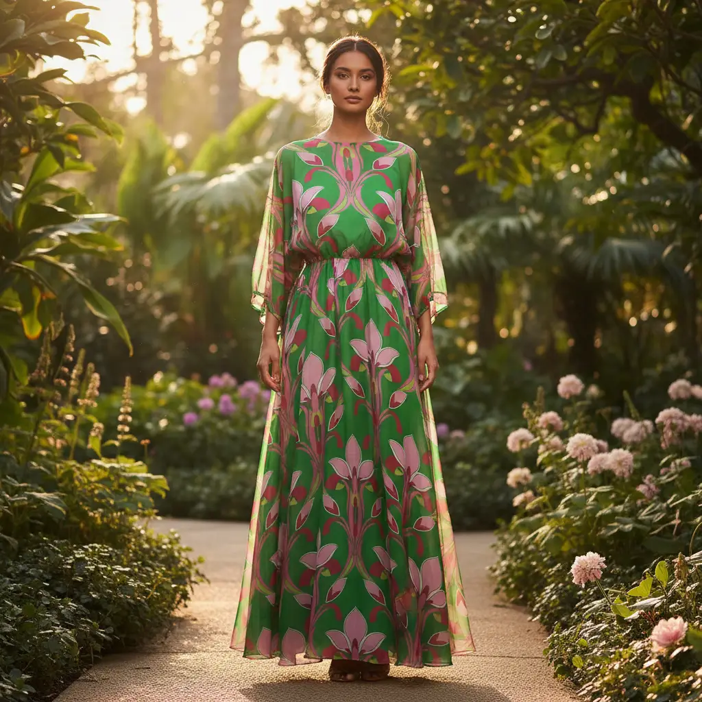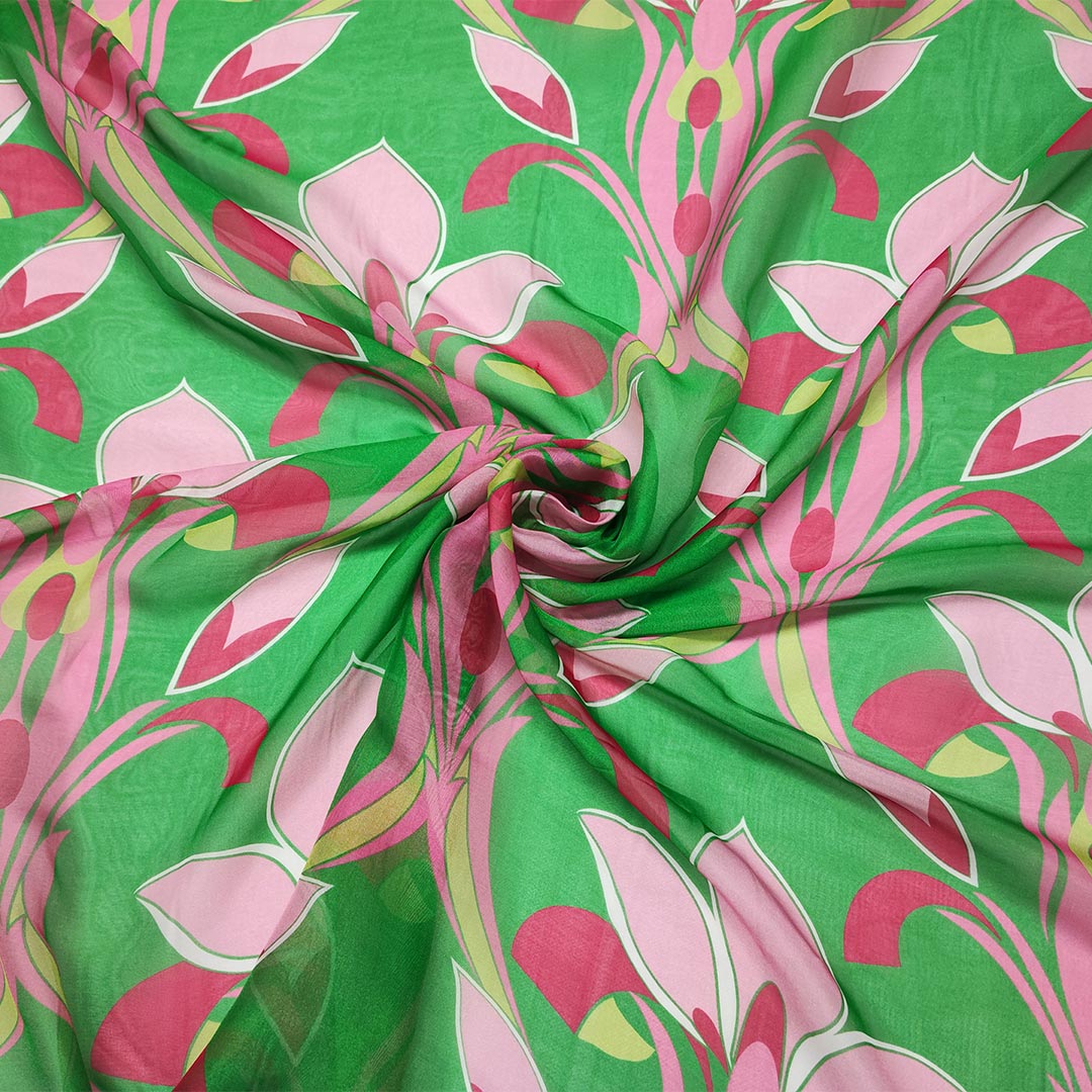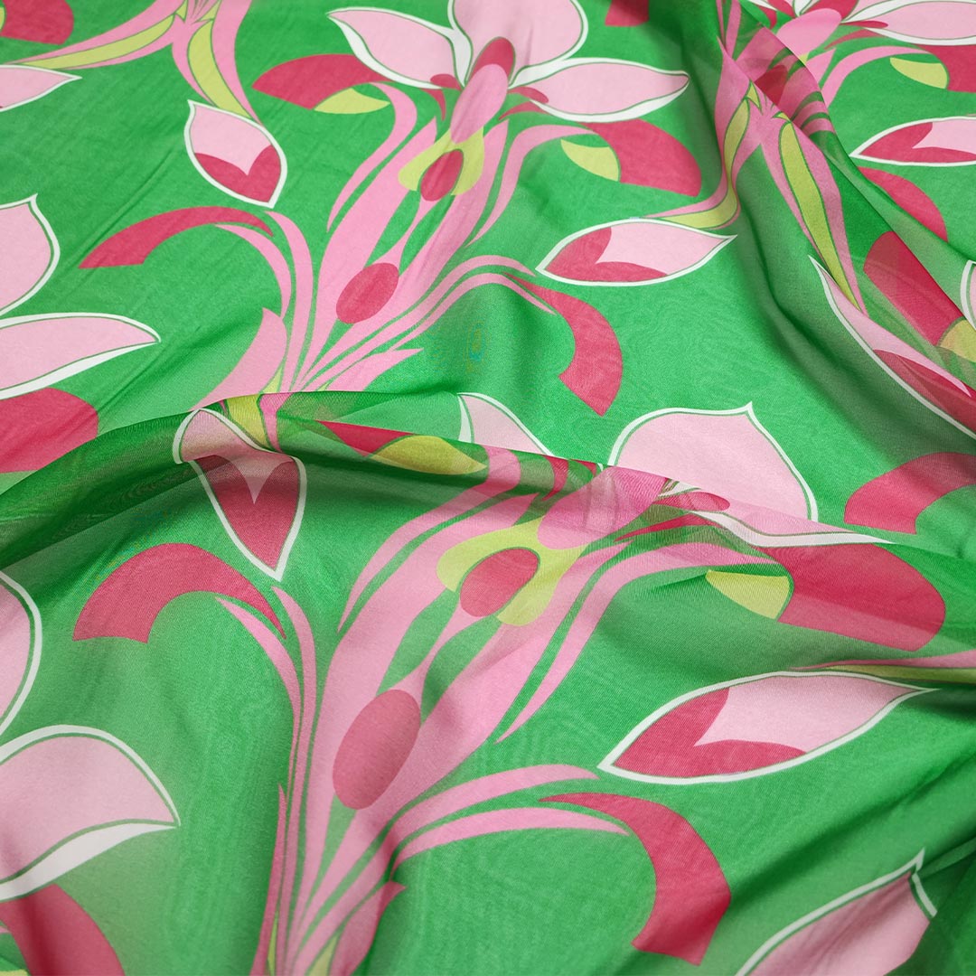 Tessuto Chiffon in seta a fantasia motivo astratto verde prato – rosa – fucsia