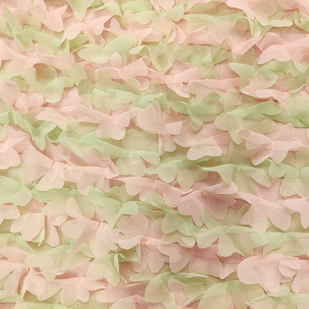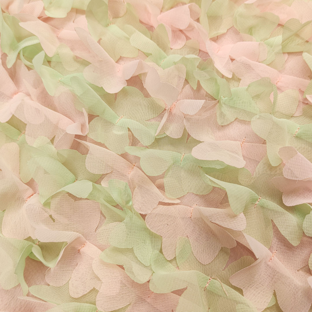 Tessuto chiffon ricamato con fiori in 3D rosa – verdino