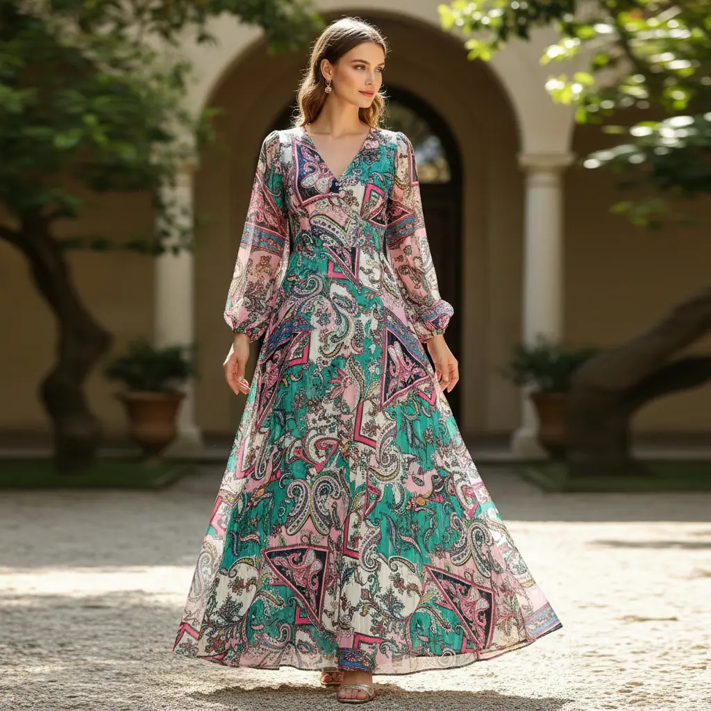Tessuto Georgette a fantasia dalla mano fine, morbida e granulosa, leggermente trasparente, si presta alla realizzazione di camicie, abiti, gonne e bluse.