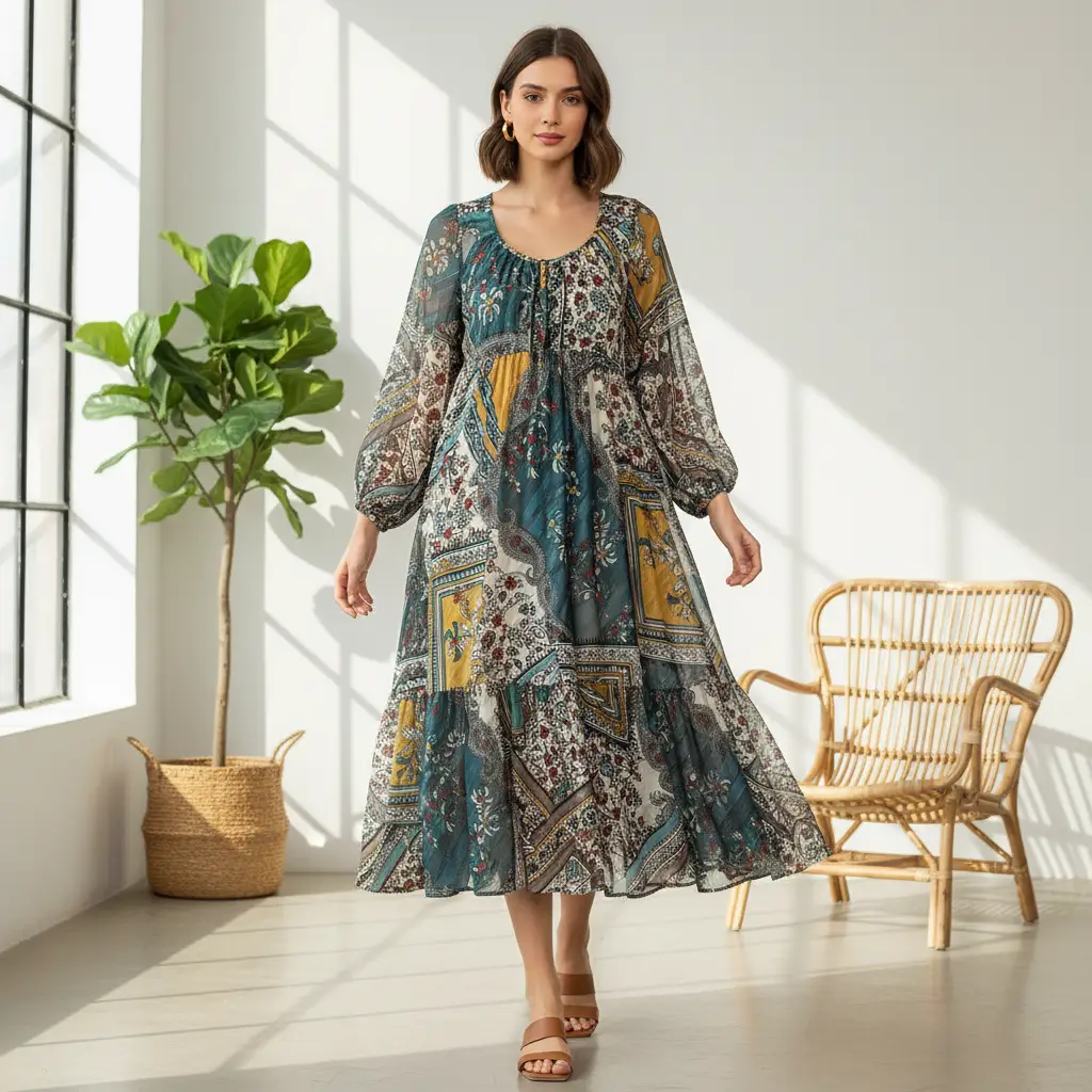 Tessuto Georgette a fantasia dalla mano fine, morbida e granulosa, leggermente trasparente, si presta alla realizzazione di camicie, abiti, gonne e bluse.