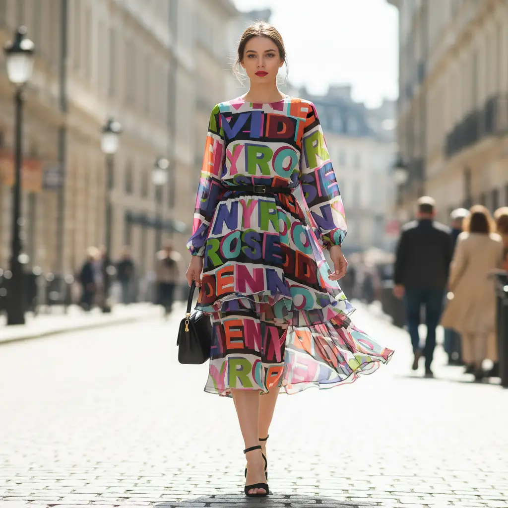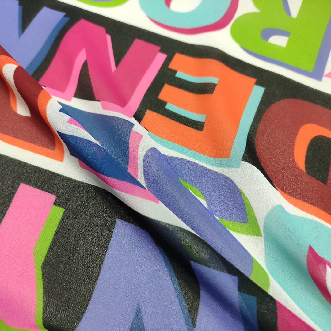 Tessuto Georgette a fantasia dalla mano fine, morbida e granulosa, leggermente trasparente, si presta alla realizzazione di camicie, abiti, gonne e bluse.