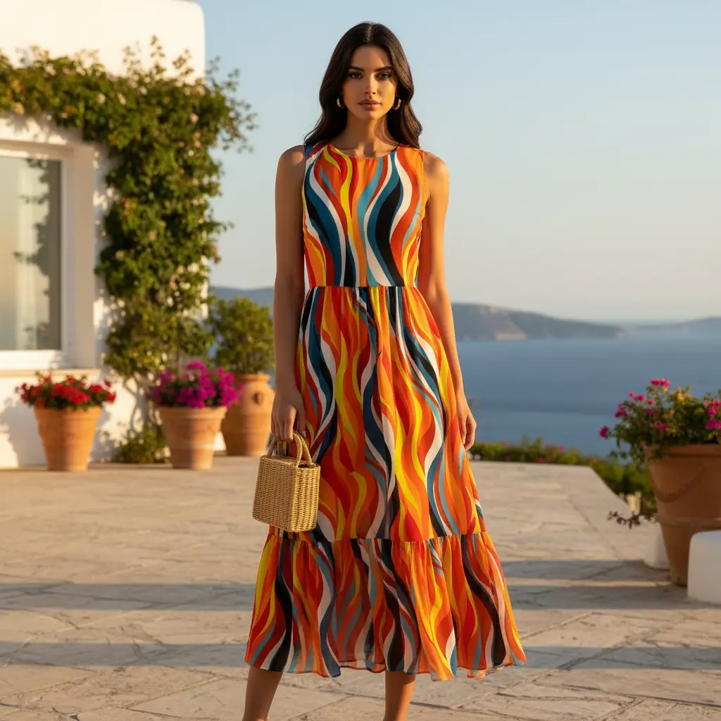 Tessuto Georgette a fantasia dalla mano fine, morbida e granulosa, leggermente trasparente, si presta alla realizzazione di camicie, abiti, gonne e bluse.
