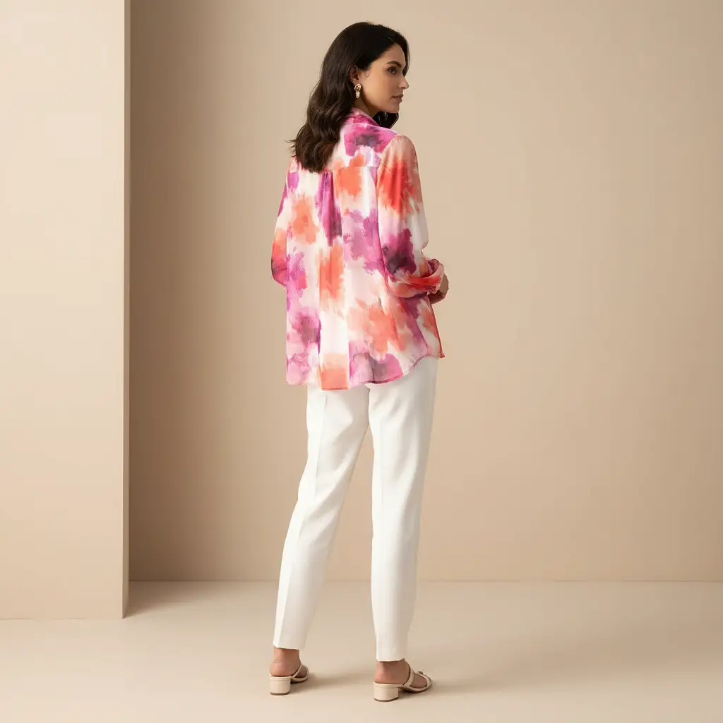 Tessuto Georgette a fantasia dalla mano fine, morbida e granulosa, leggermente trasparente, si presta alla realizzazione di camicie, abiti, gonne e bluse.