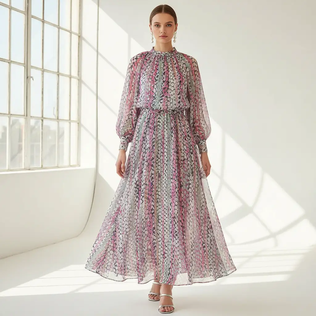Tessuto Georgette a fantasia dalla mano fine, morbida e granulosa, leggermente trasparente, si presta alla realizzazione di camicie, abiti, gonne e bluse.
