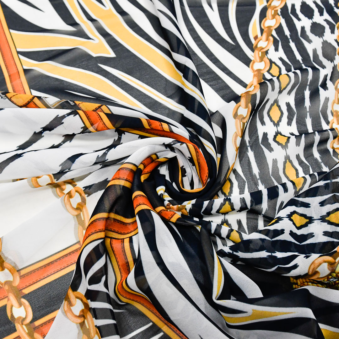 Tessuto Georgette a fantasia dalla mano fine, morbida e granulosa, leggermente trasparente, si presta alla realizzazione di camicie, abiti, gonne e bluse.
