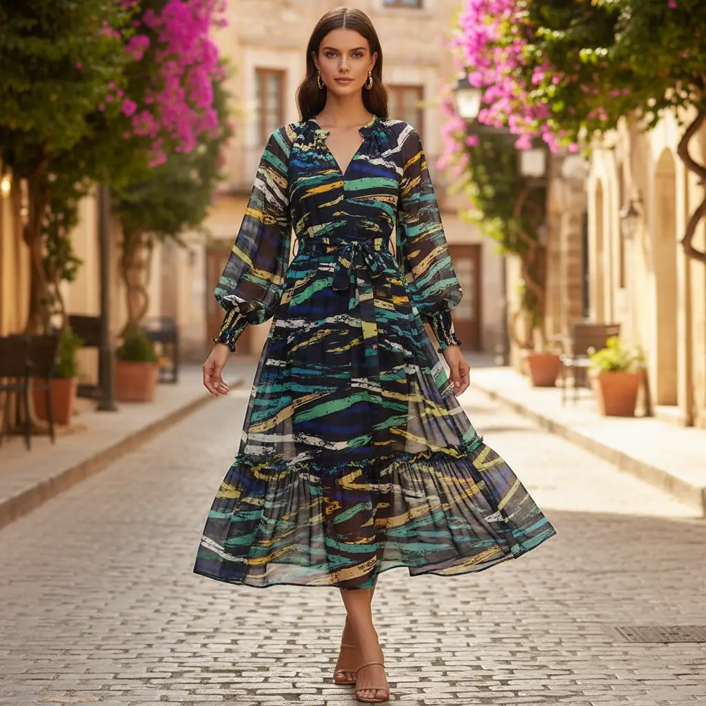 Tessuto Georgette a fantasia dalla mano fine, morbida e granulosa, leggermente trasparente, si presta alla realizzazione di camicie, abiti, gonne e bluse.