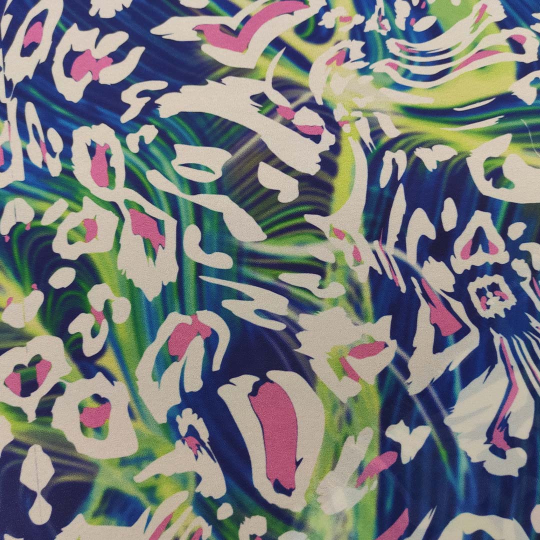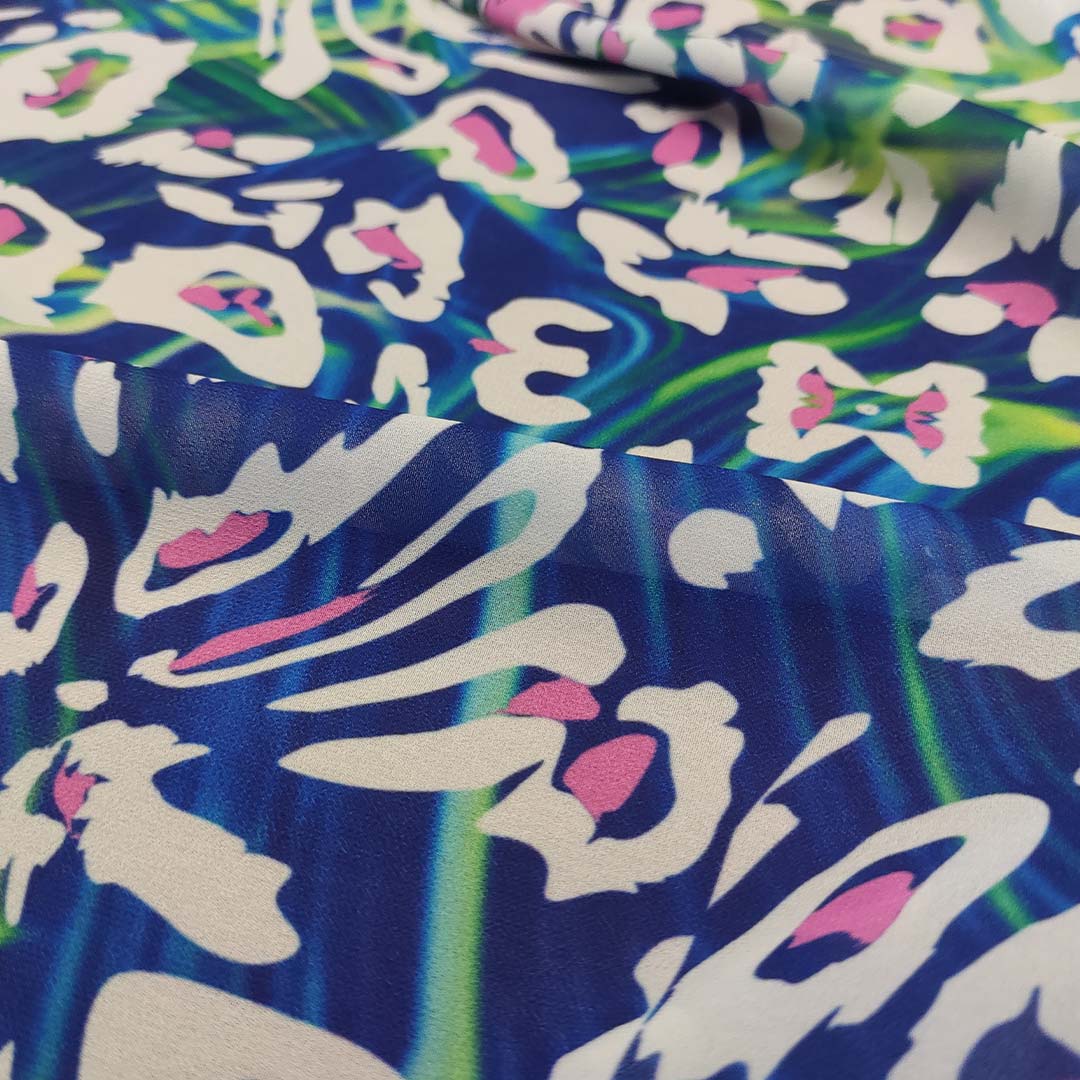 Tessuto Georgette a fantasia dalla mano fine, morbida e granulosa, leggermente trasparente, si presta alla realizzazione di camicie, abiti, gonne e bluse.
