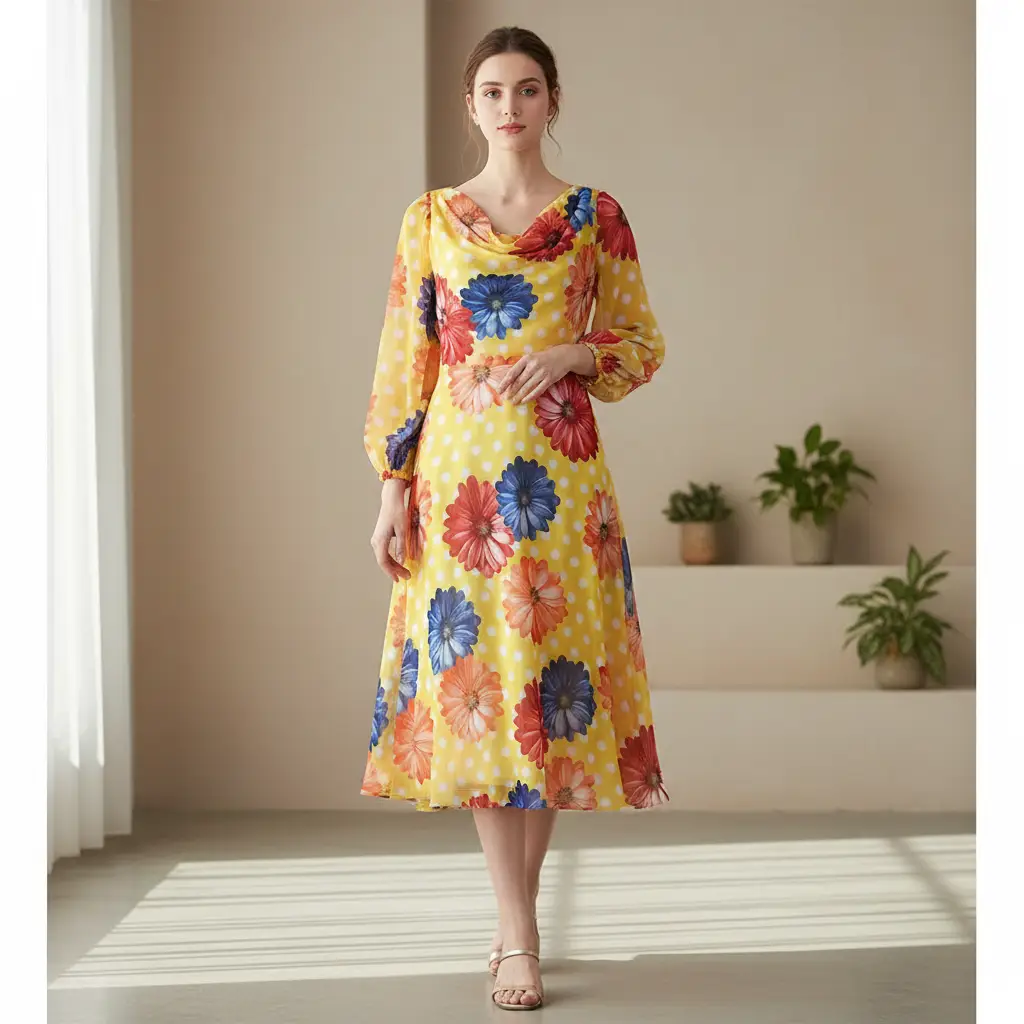 Tessuto Georgette a fantasia dalla mano fine, morbida e granulosa, leggermente trasparente, si presta alla realizzazione di camicie, abiti, gonne e bluse.