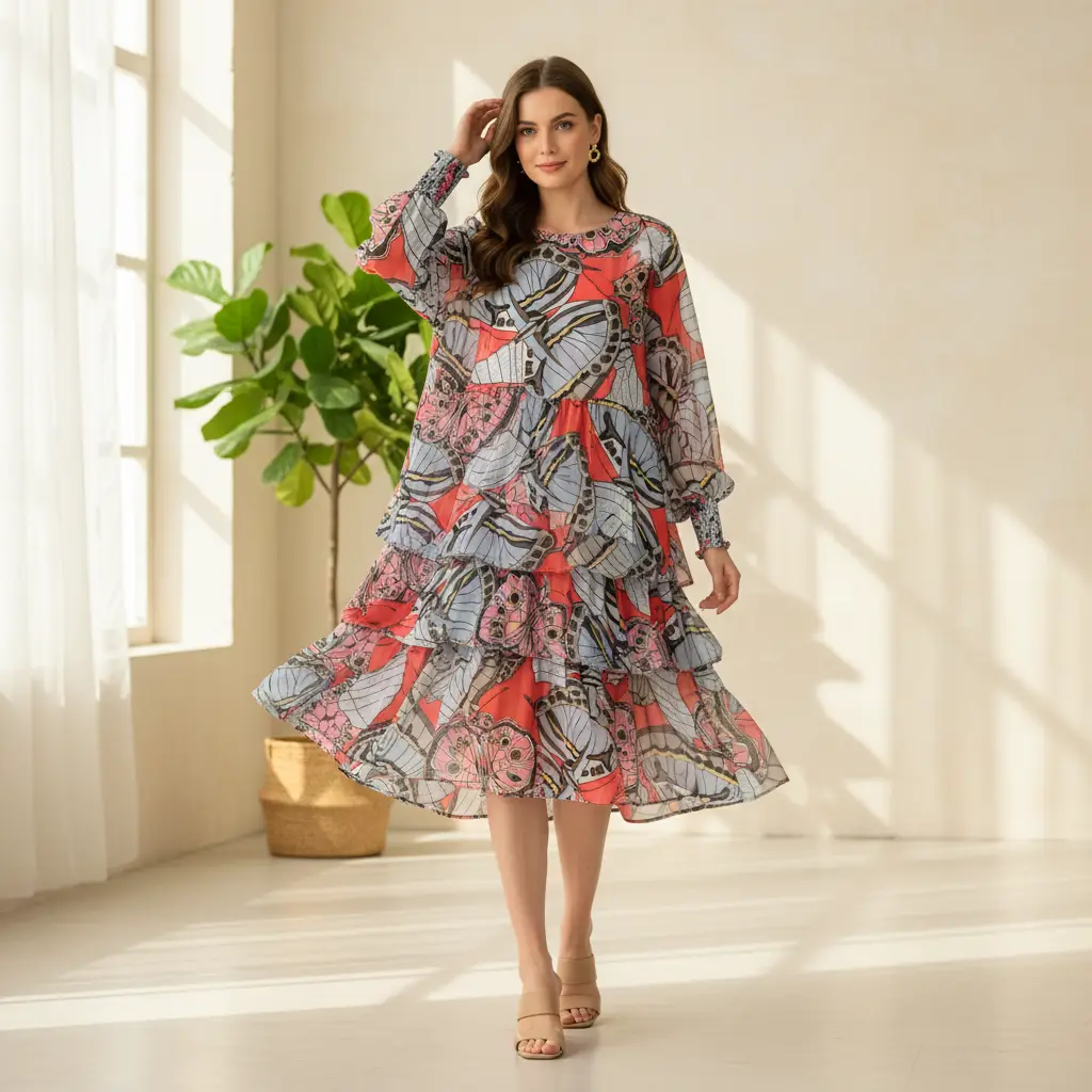 Tessuto Georgette a fantasia dalla mano fine, morbida e granulosa, leggermente trasparente, si presta alla realizzazione di camicie, abiti, gonne e bluse.
