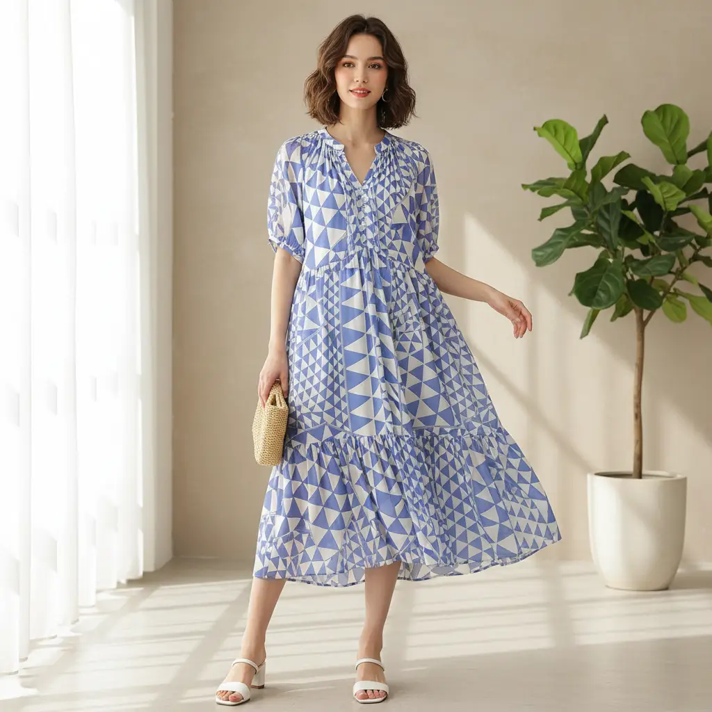 Tessuto Georgette a fantasia dalla mano fine, morbida e granulosa, leggermente trasparente, si presta alla realizzazione di camicie, abiti, gonne e bluse.