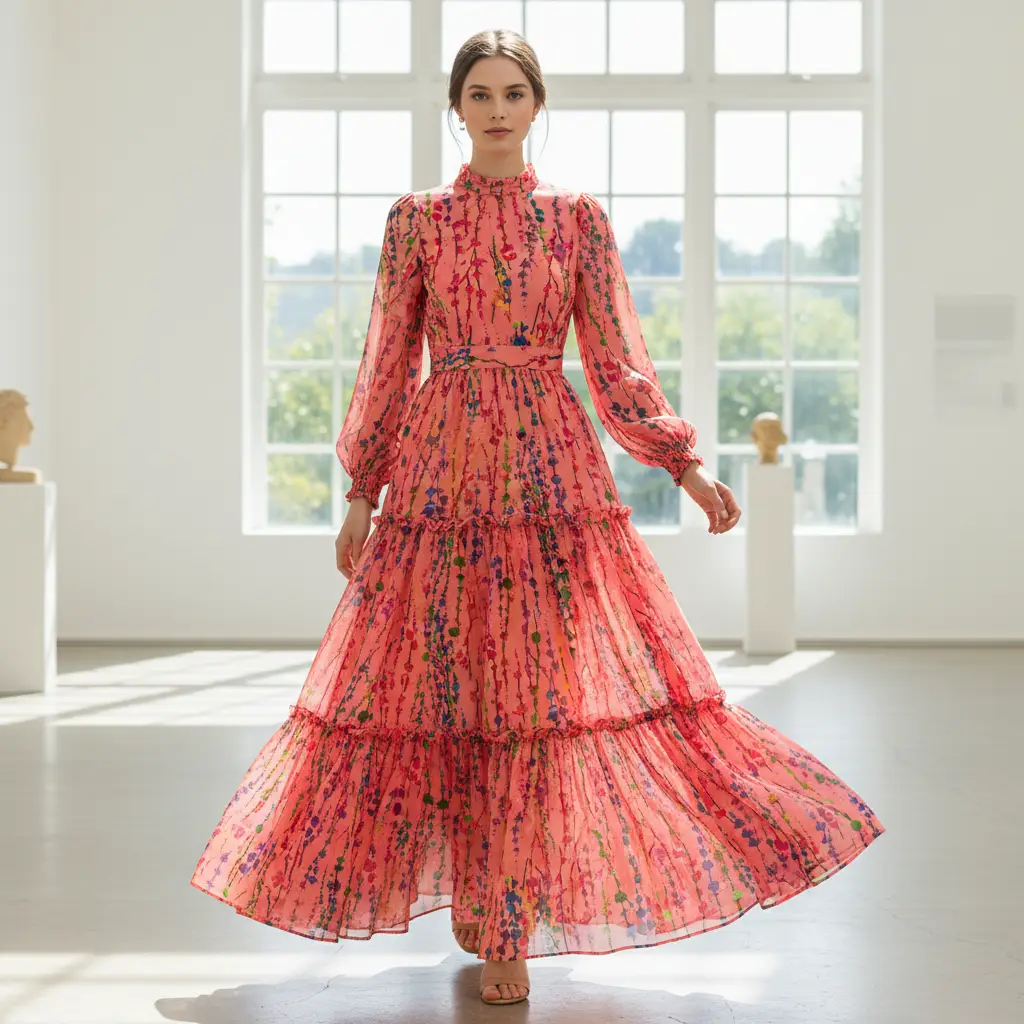 Tessuto Georgette a fantasia dalla mano fine, morbida e granulosa, leggermente trasparente, si presta alla realizzazione di camicie, abiti, gonne e bluse.