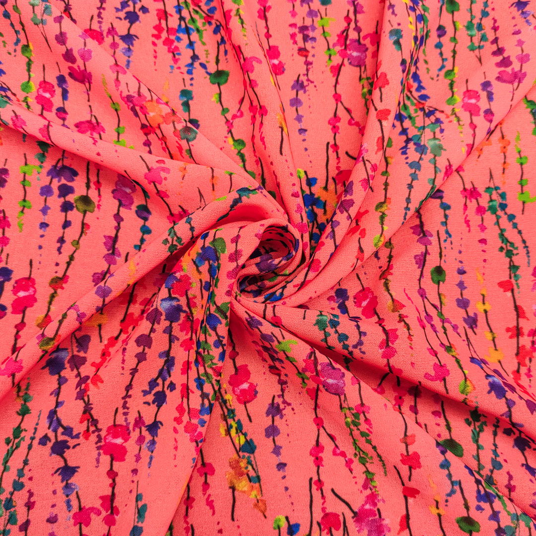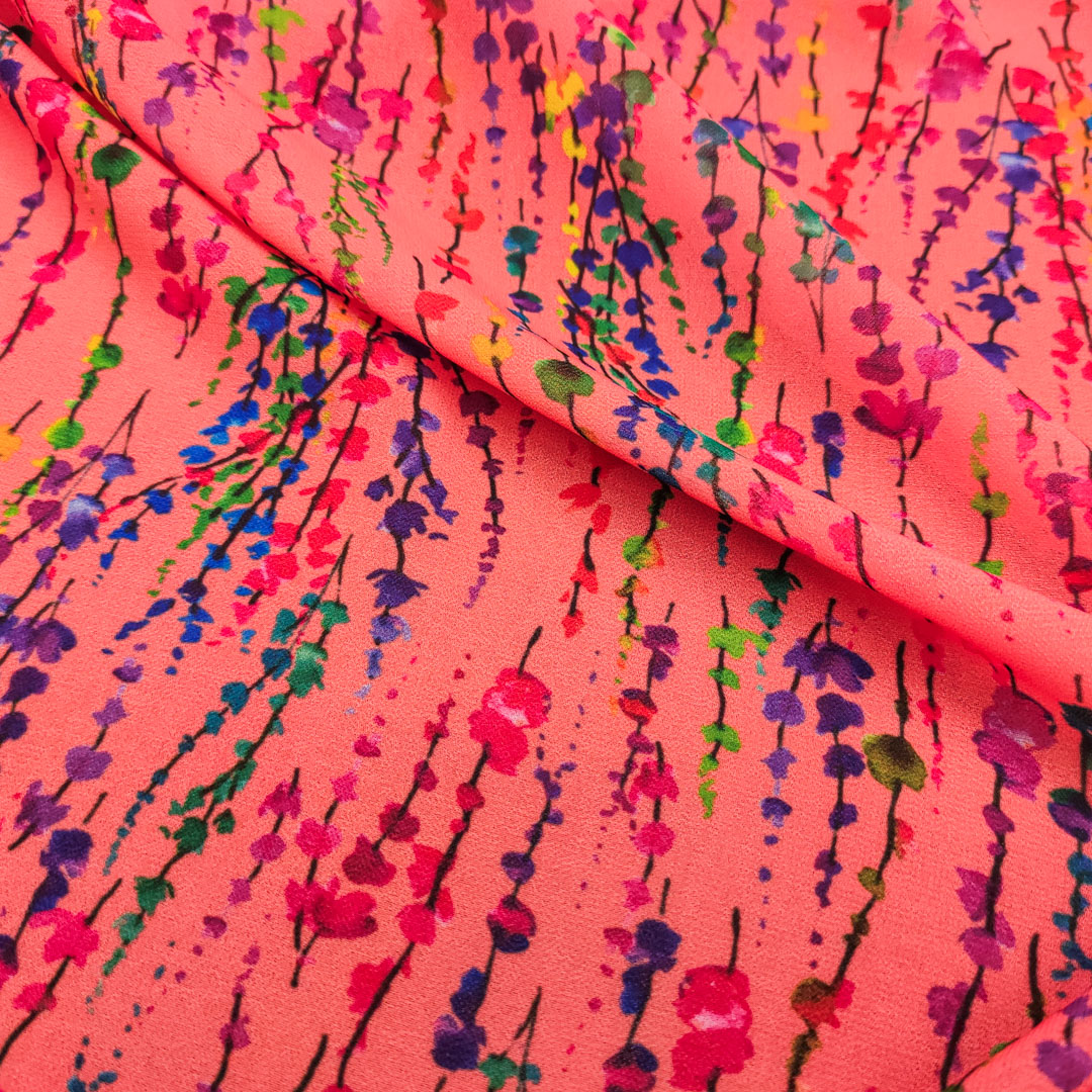 Tessuto Georgette a fantasia motivo astratto corallo – verde – viola