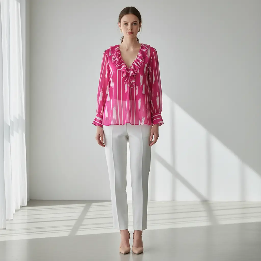 Tessuto Georgette a fantasia dalla mano fine, morbida e granulosa, leggermente trasparente, si presta alla realizzazione di camicie, abiti, gonne e bluse.