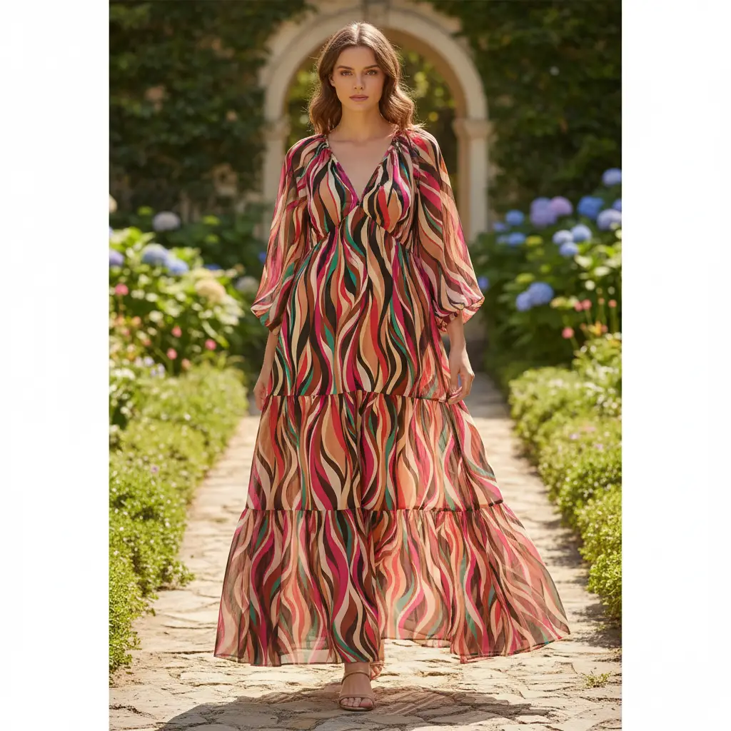 Tessuto Georgette a fantasia dalla mano fine, morbida e granulosa, leggermente trasparente, si presta alla realizzazione di camicie, abiti, gonne e bluse.
